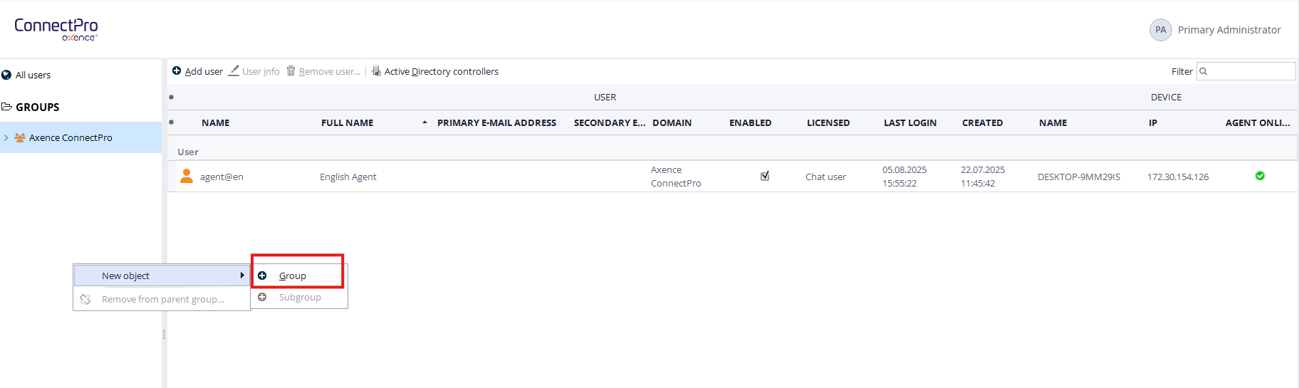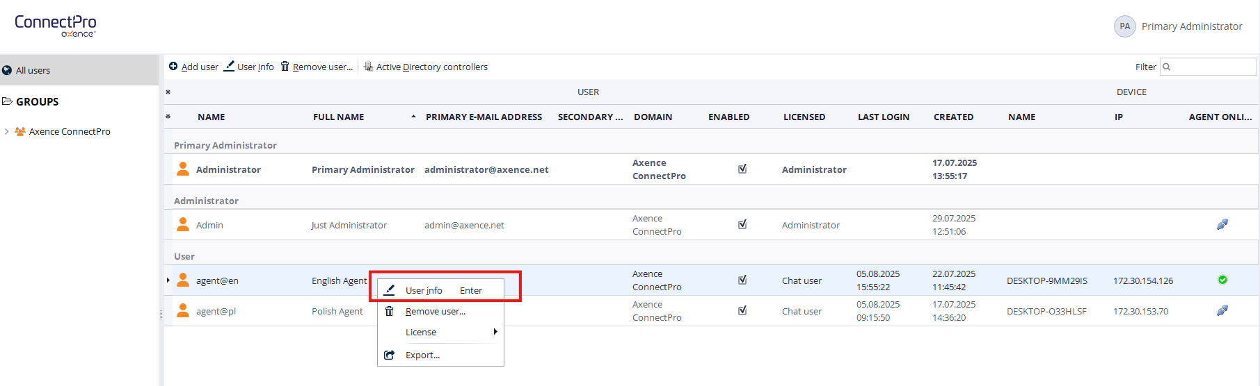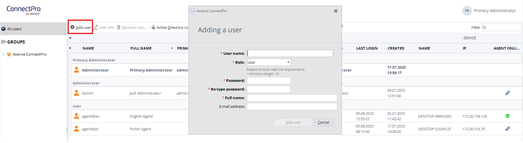 - Agent ConnectPro installation on a computer (automatically adds the user to the list),