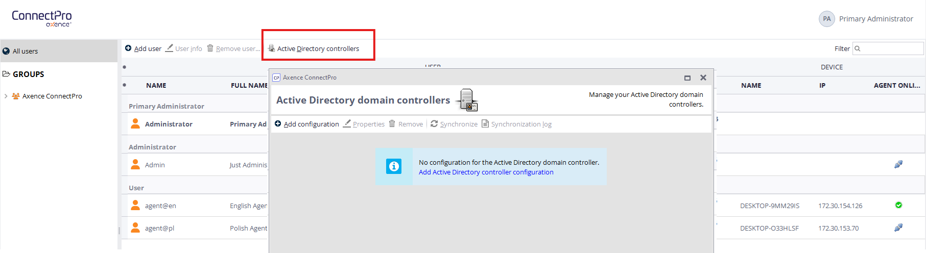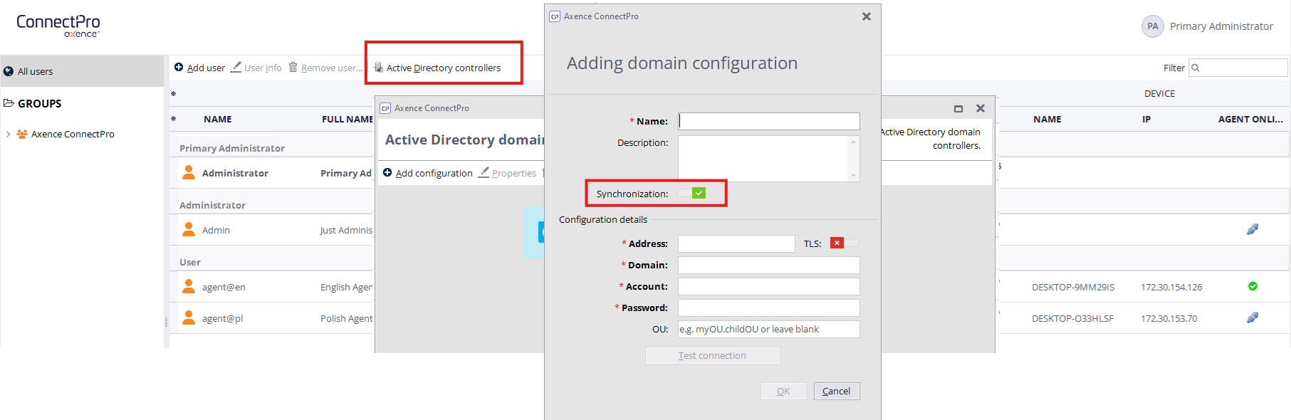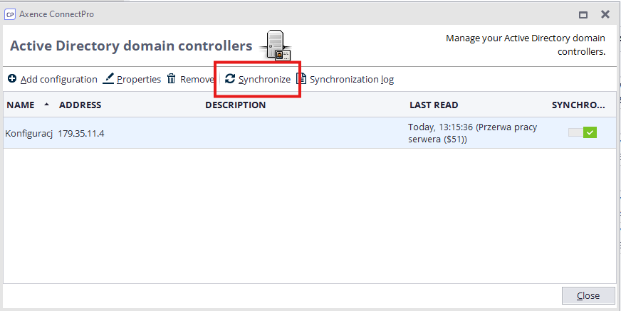 - clicking the Active Directory Controllers button and configuring a domain controller (with the synchronization toggle set to green), and then running synchronization.