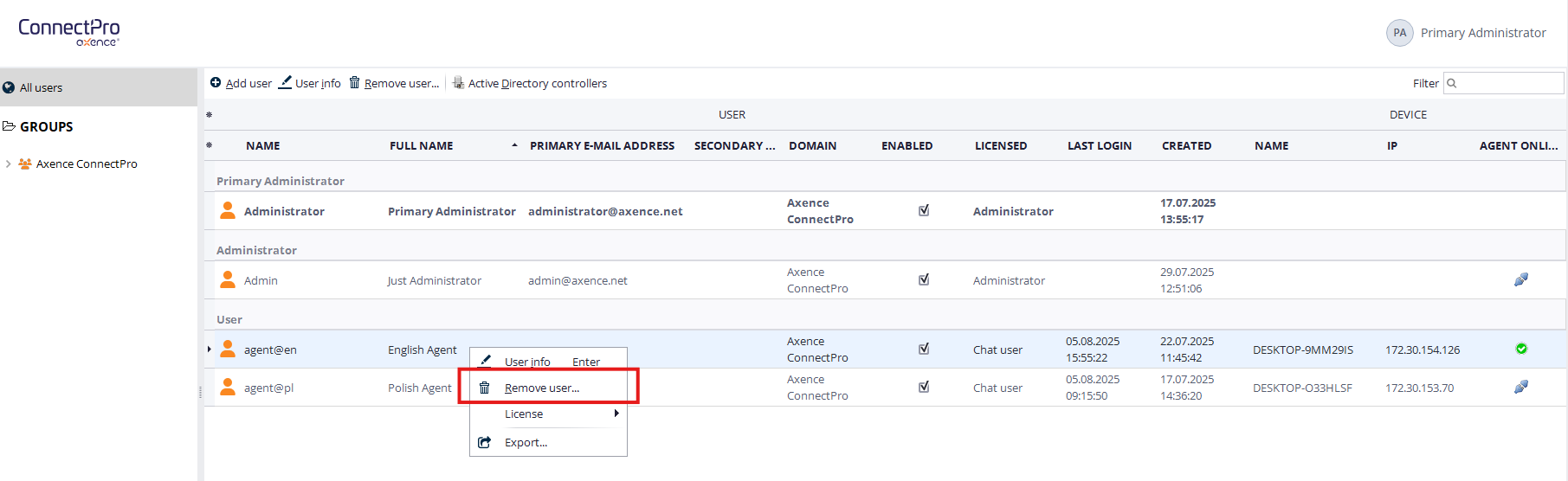In order to delete user account, we need to right-click the corresponding row and choosing Remove user option.