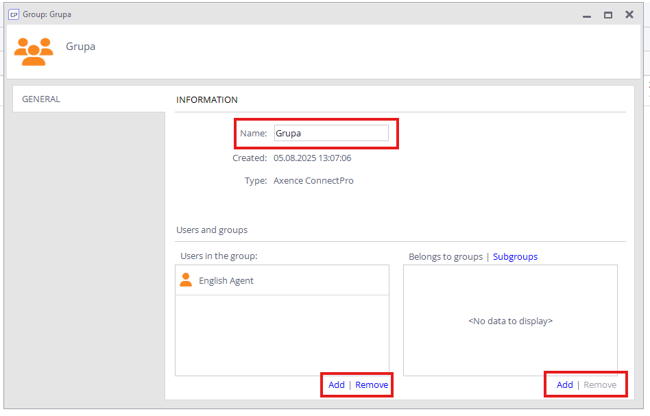 Details of existing group are available after right-clicking given group name and choosing Group Information options. In this view we can also change group's name, users and add or delete subgroups.