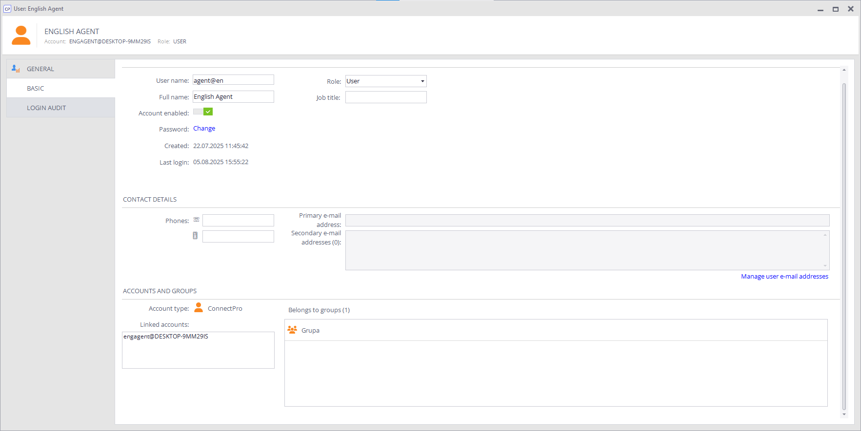 Note: If a user comes from an Active Directory controller, any synchronized data cannot be edited.