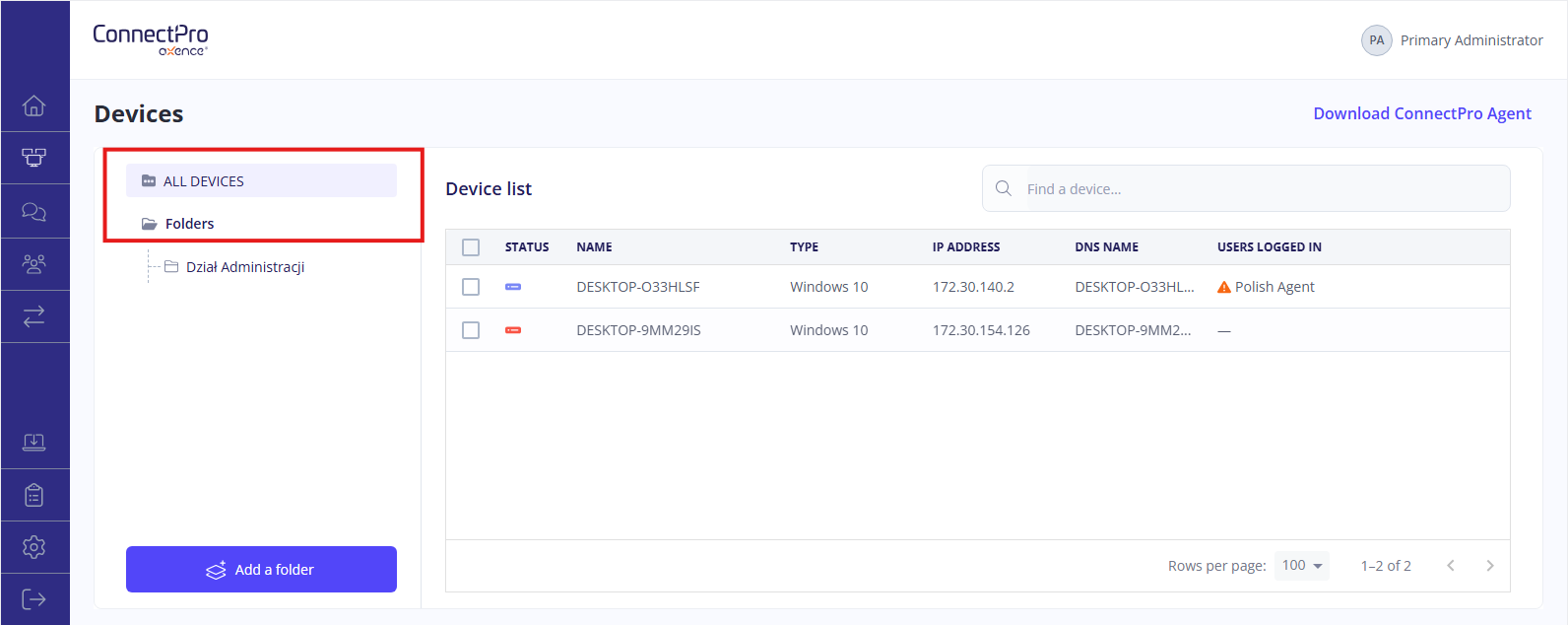 By default all devices are displayed, but we can limit the view to devices in a specific folder by selecting it from the list on the left.