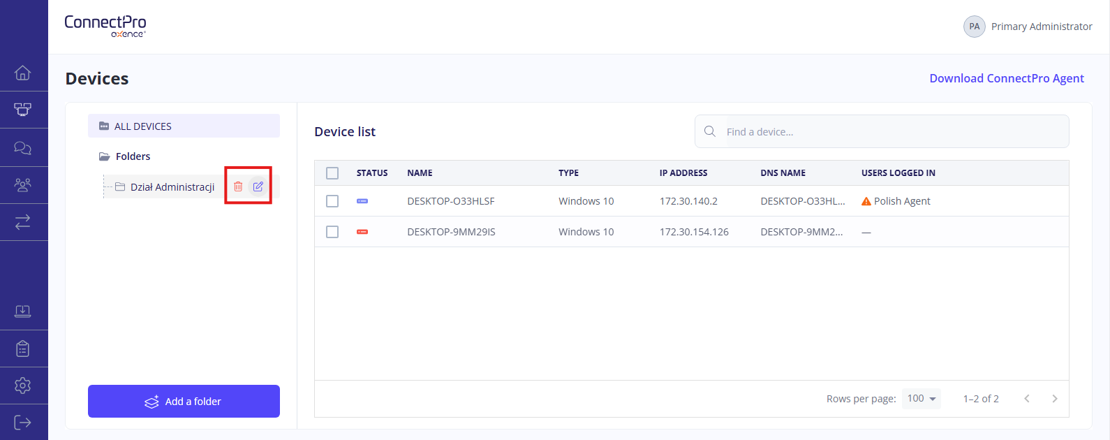 Deleting a folder does not remove the devices assigned to it from ConnectPro.