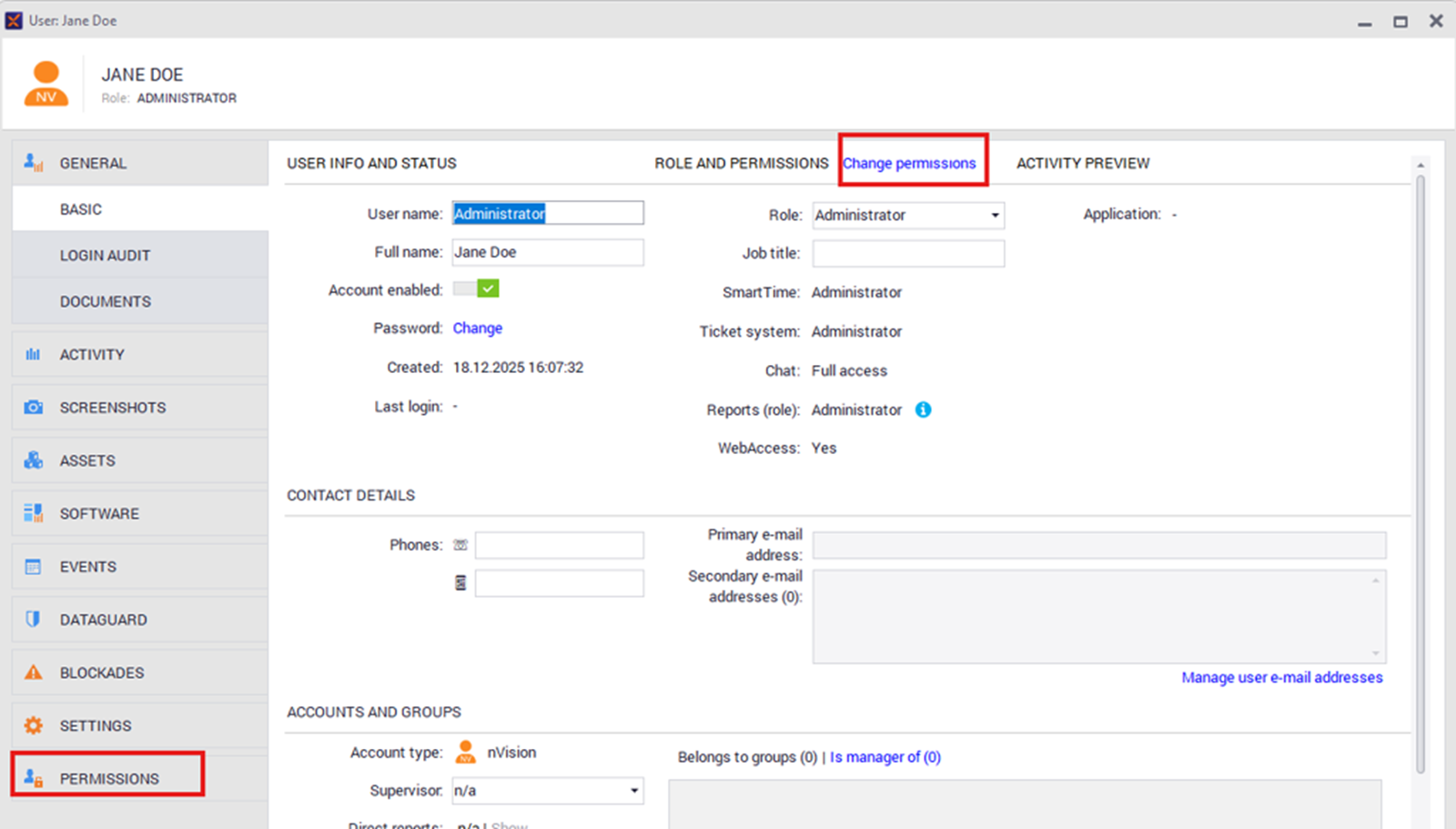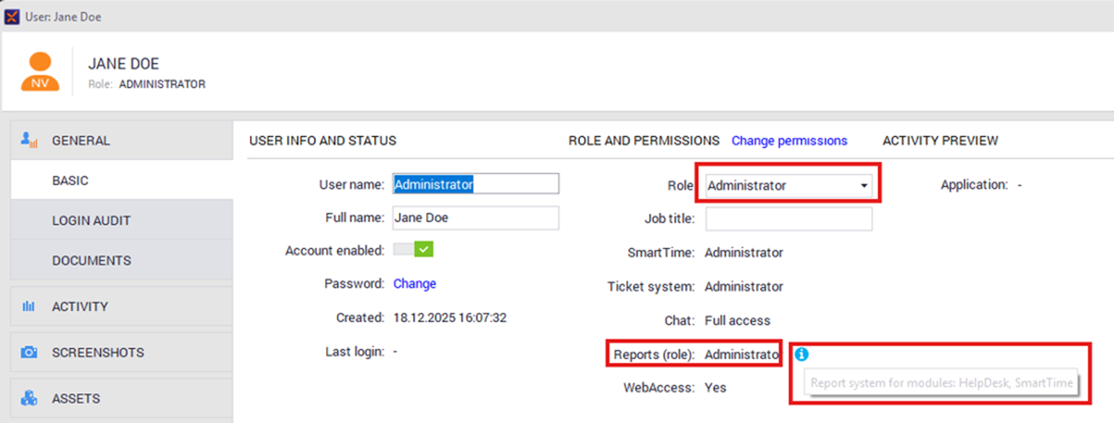 In the Permissions tab, you can adjust the user’s role for the Reports module by raising or lowering its level.