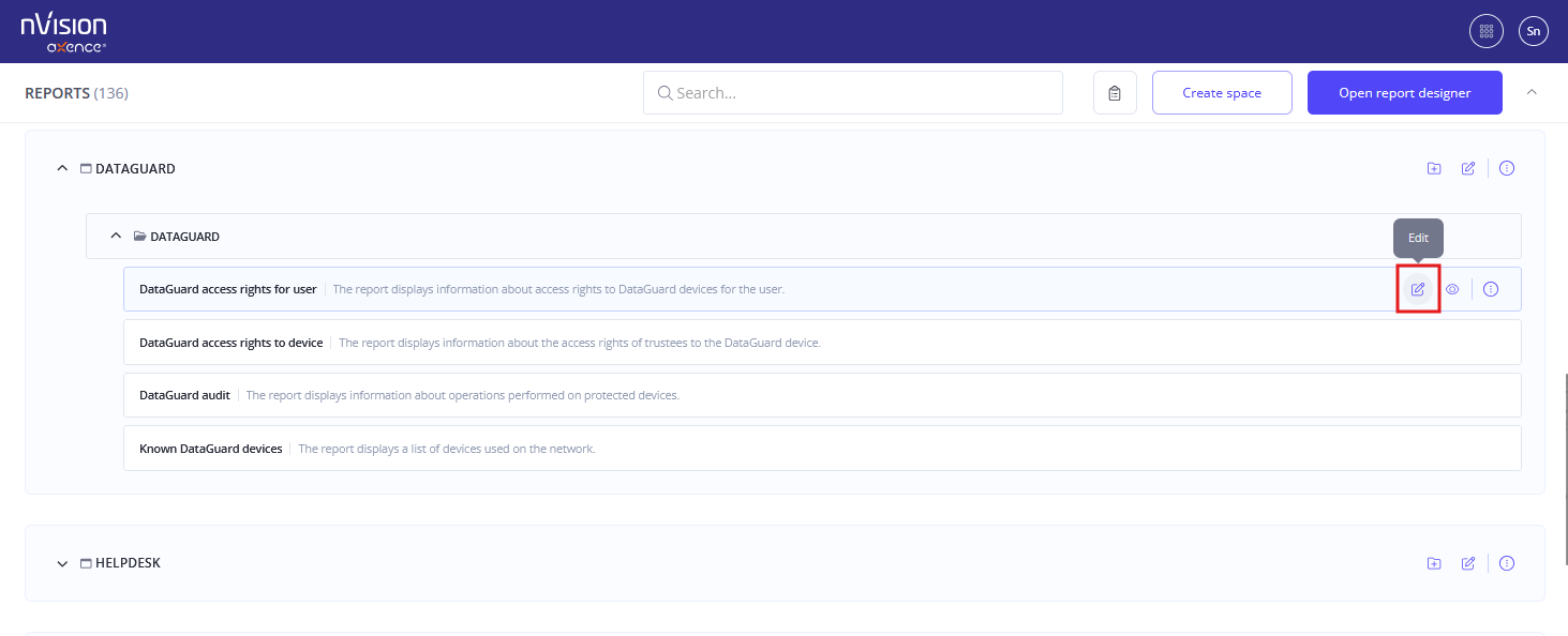 Every report available in the system can be modified. Report editing is performed directly from the report list, using the Edit option.
