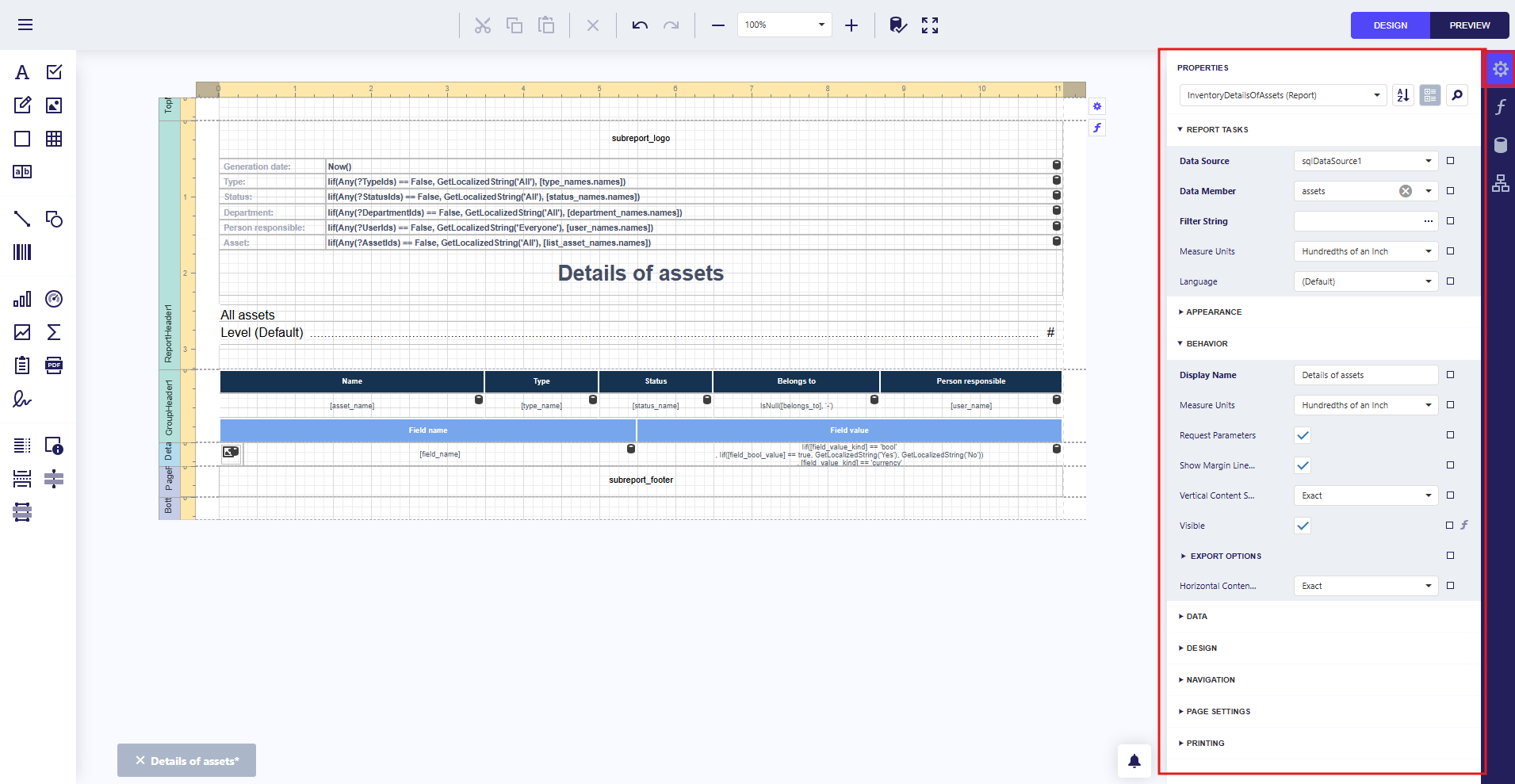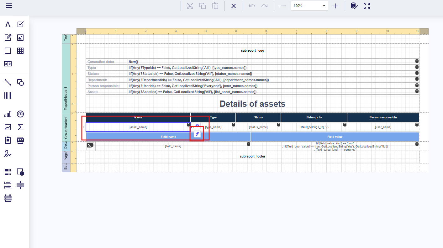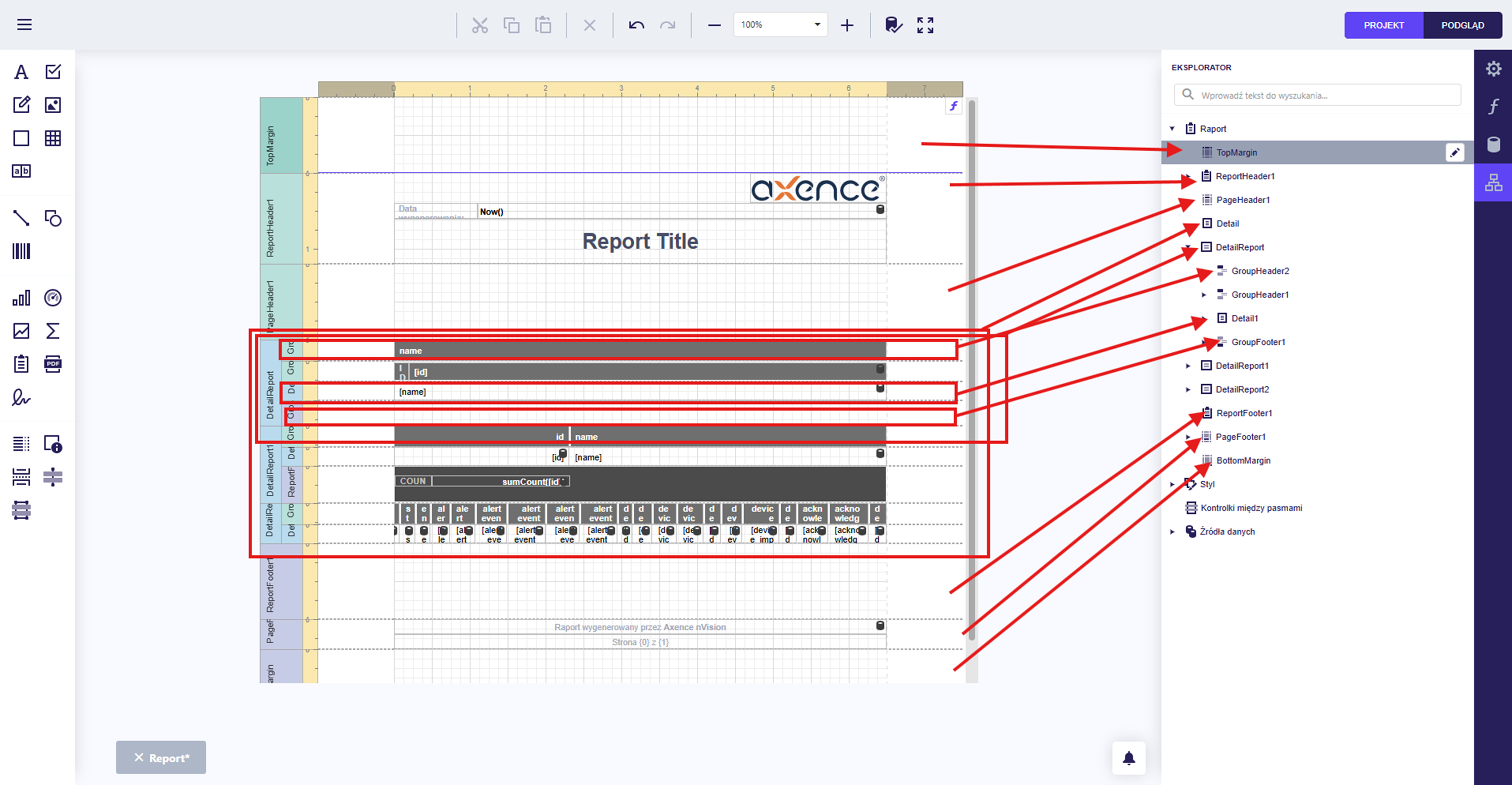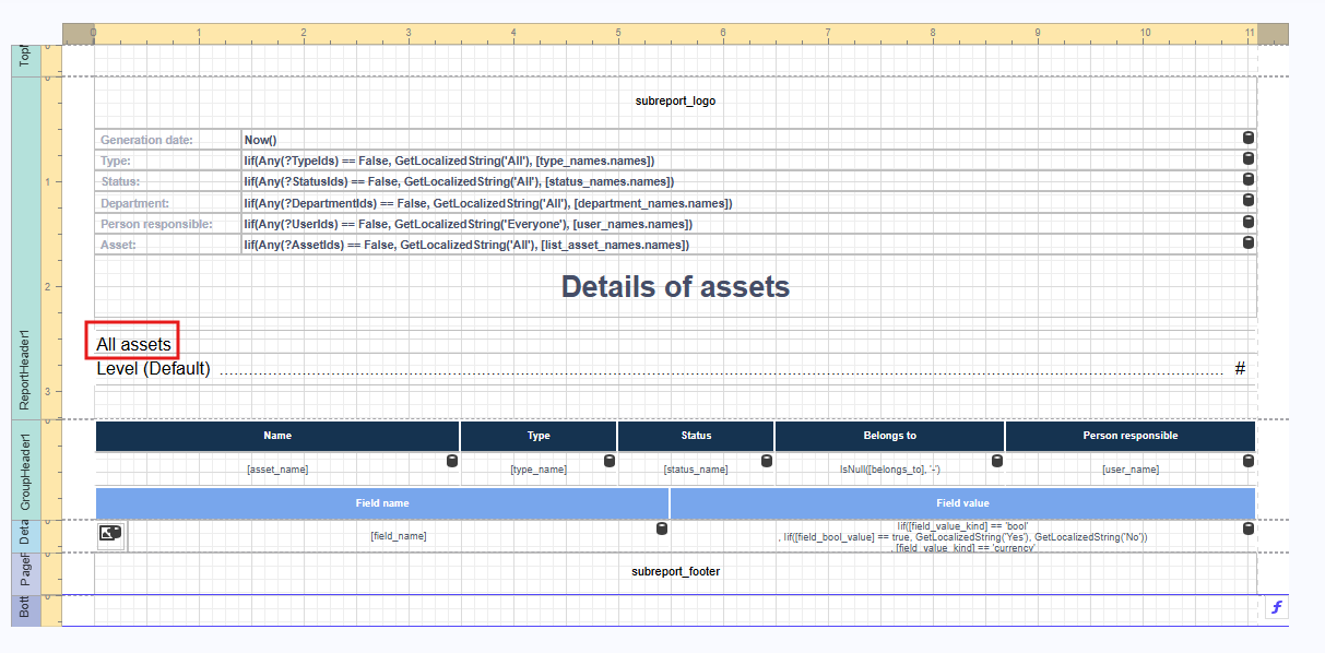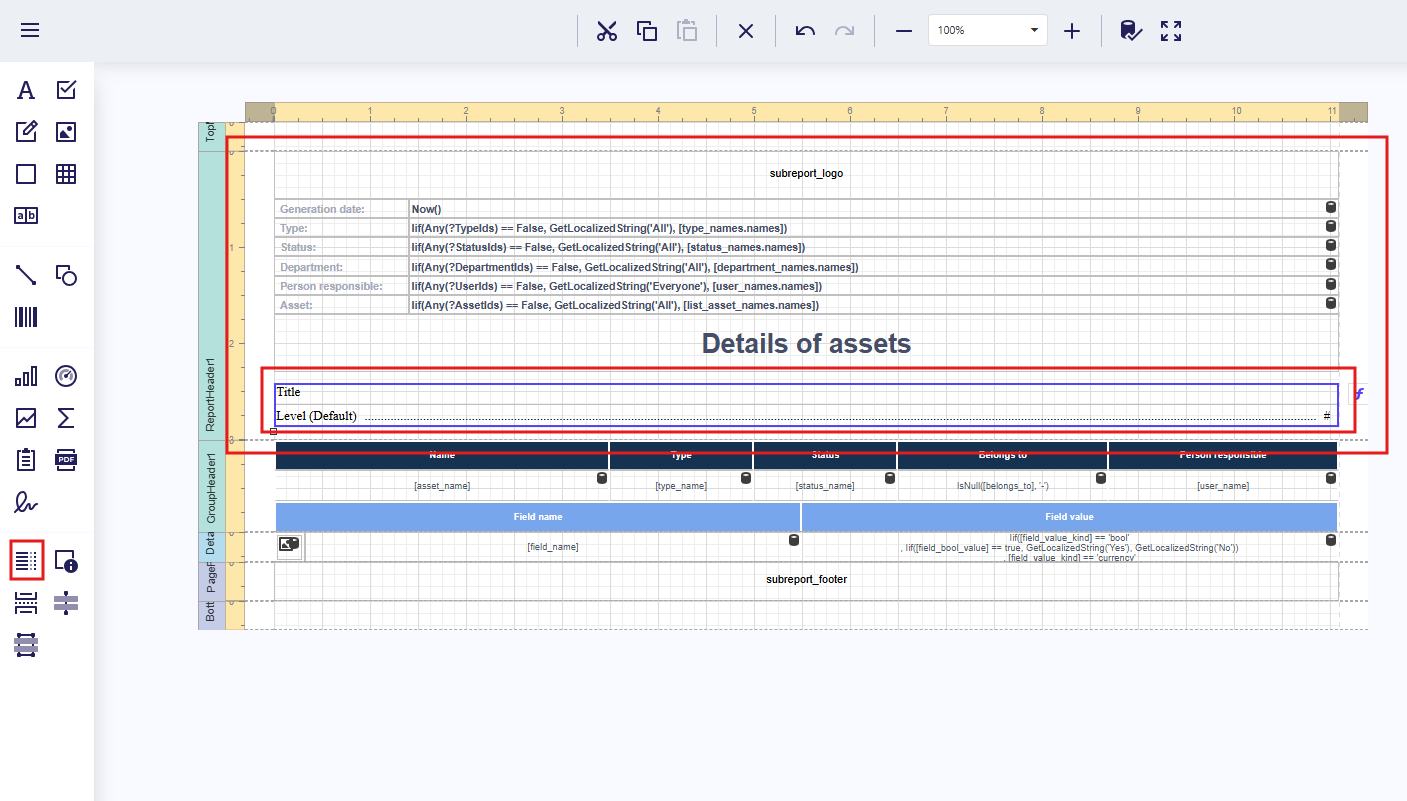 | Report details | Core data section; can contain nested subgroups (header, details, footer) |