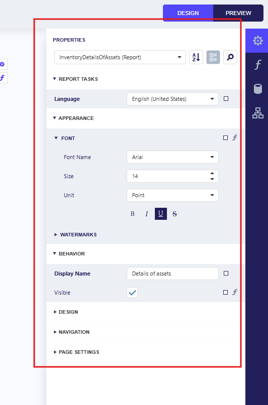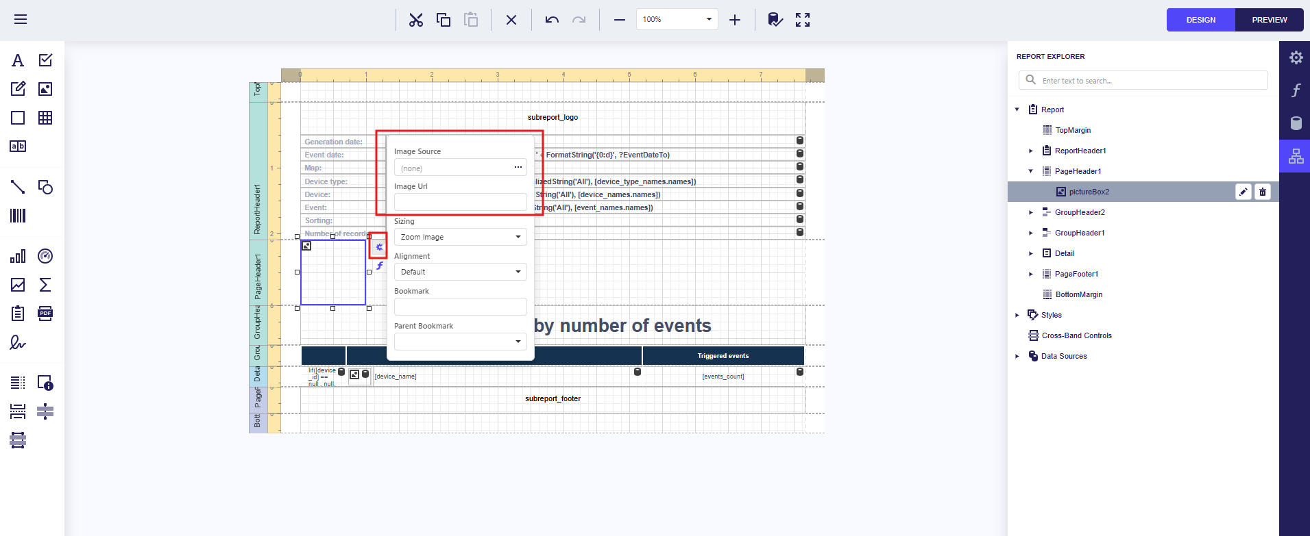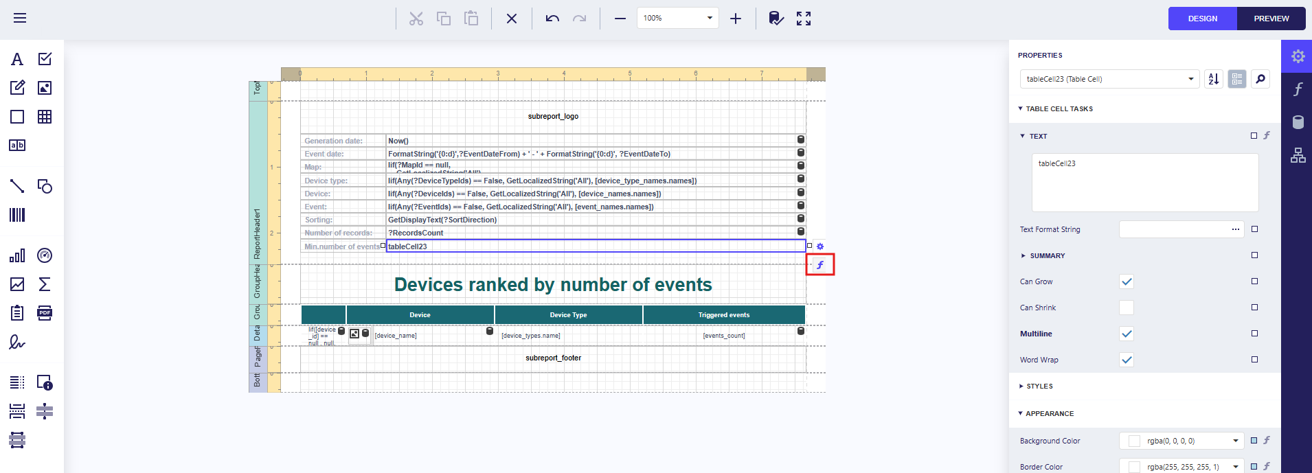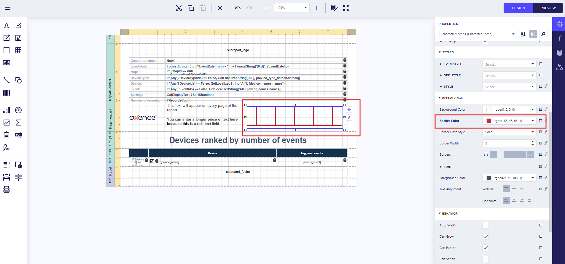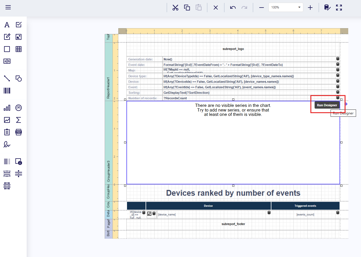 | Report details | Core data section; can contain nested subgroups (header, details, footer) |