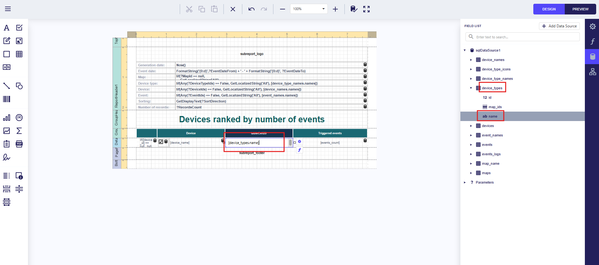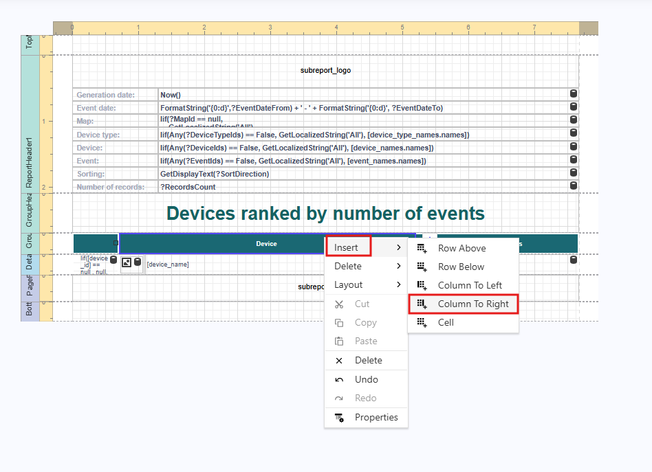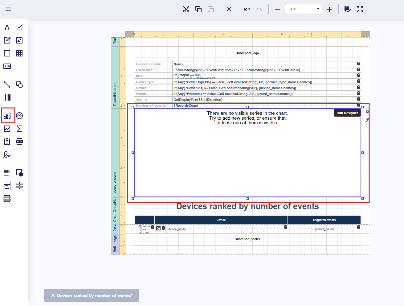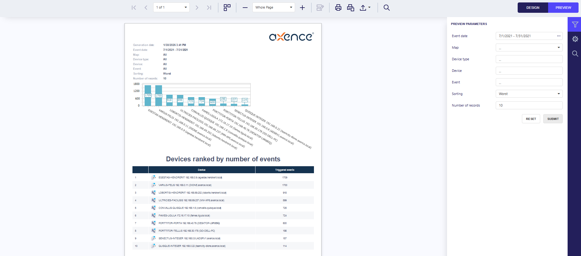 Add a bar chart to the report Device Ranking by Number of Events showing the distribution of event counts per device.