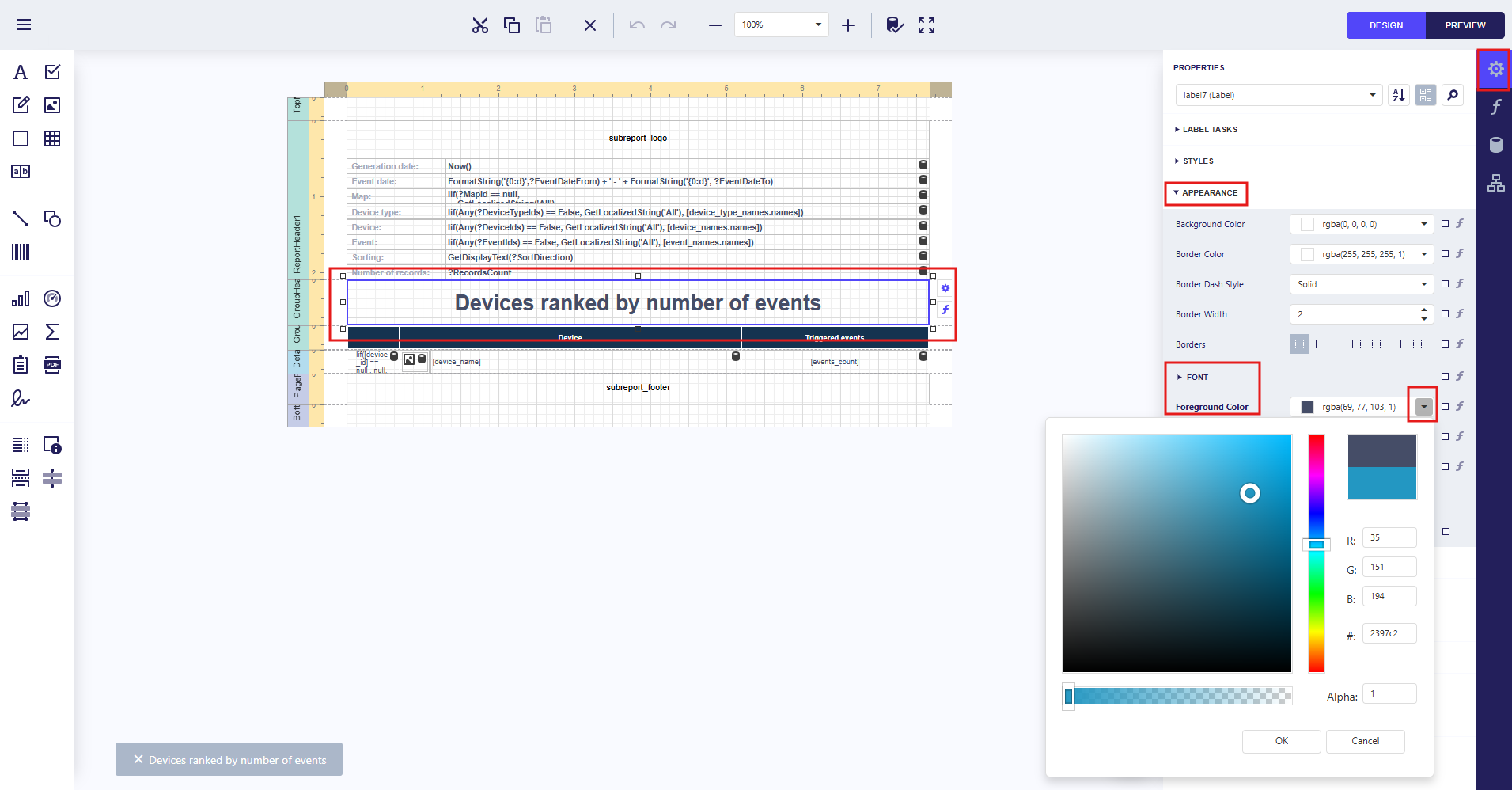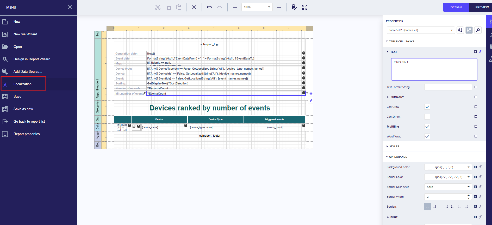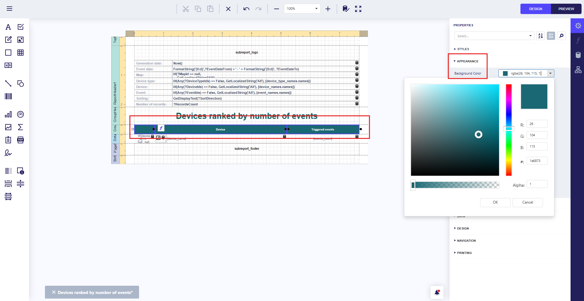 Add a bar chart to the report Device Ranking by Number of Events showing the distribution of event counts per device.