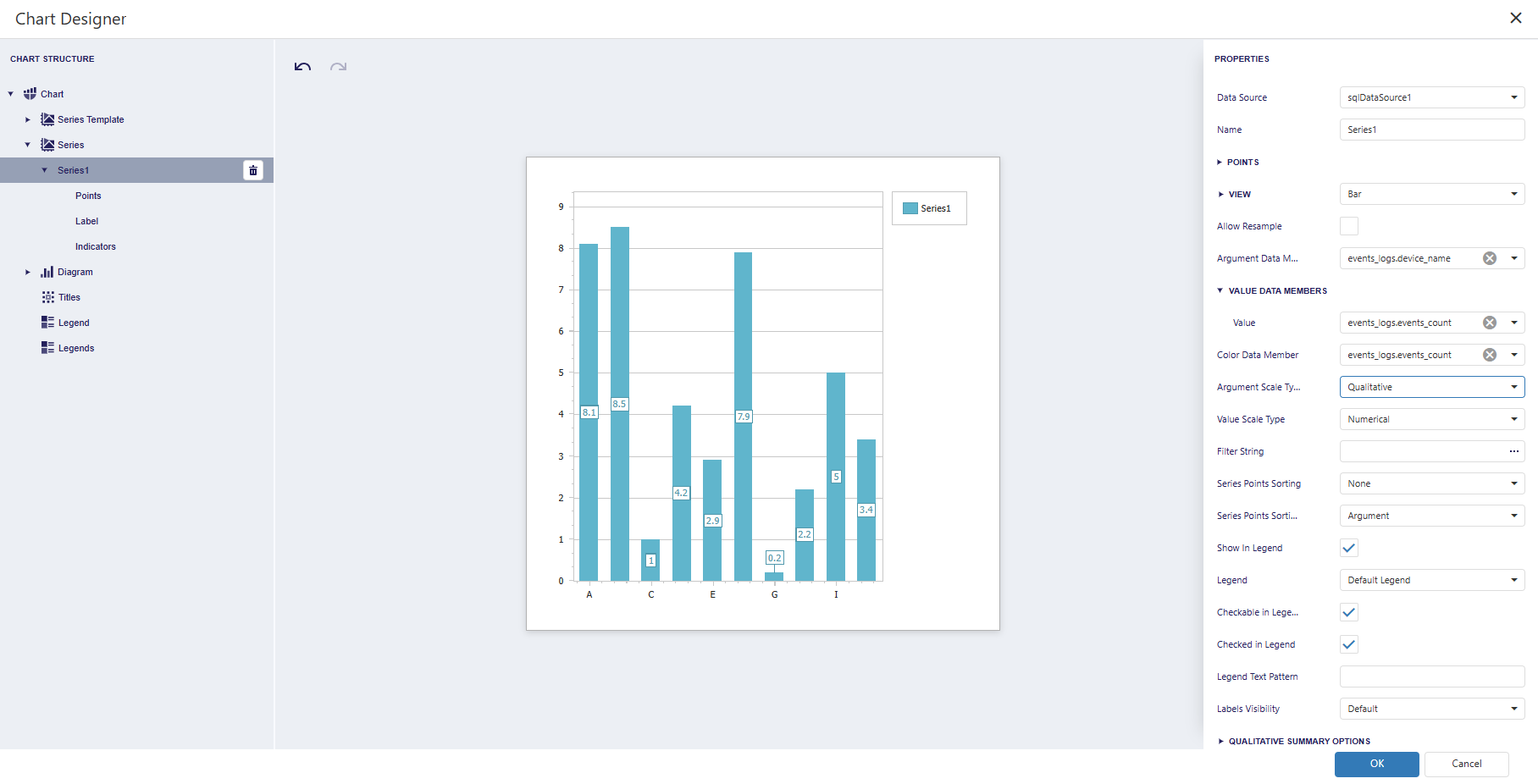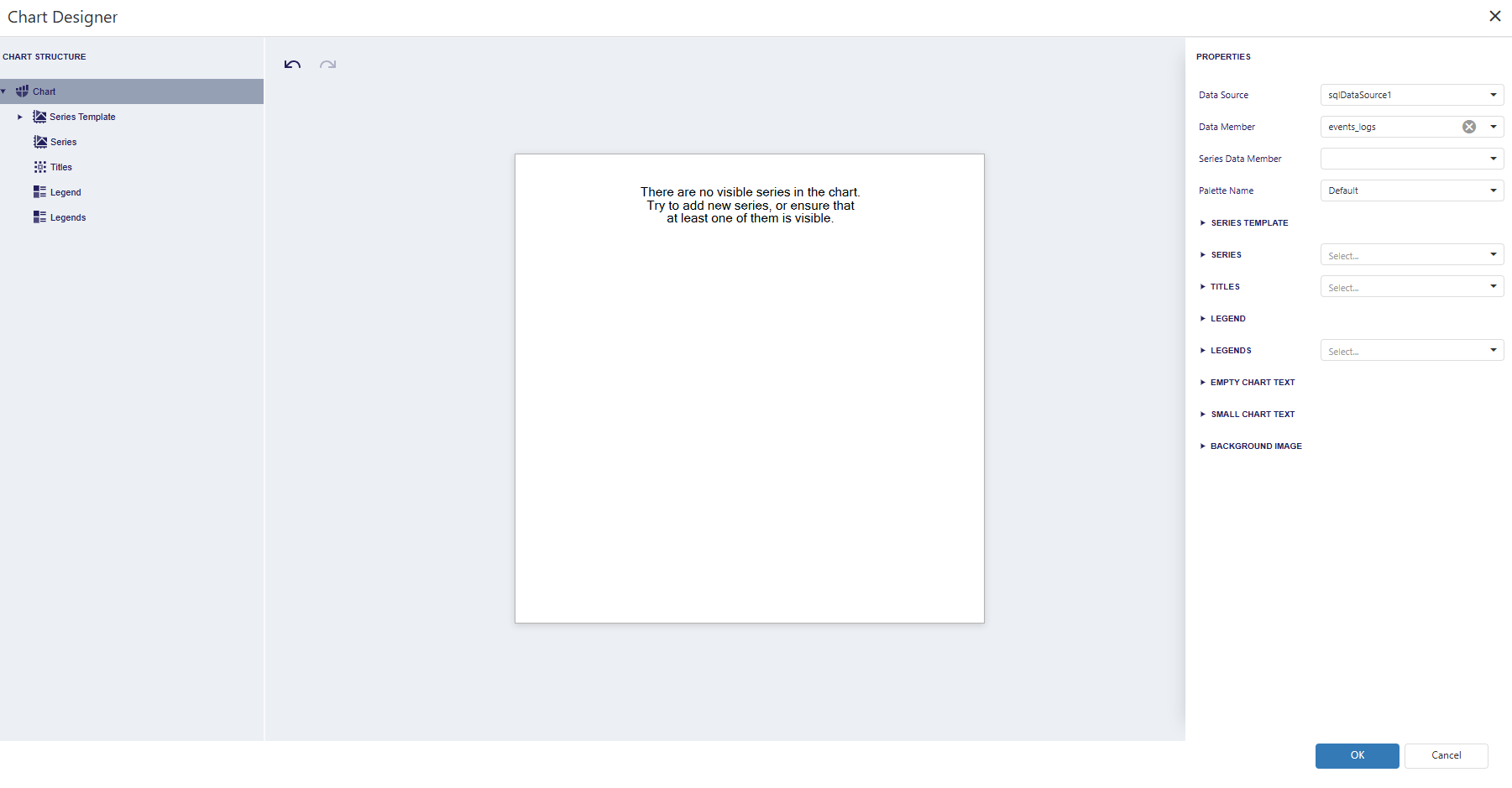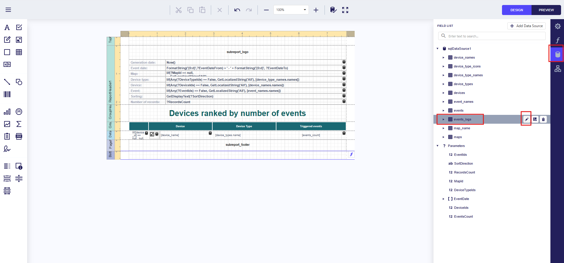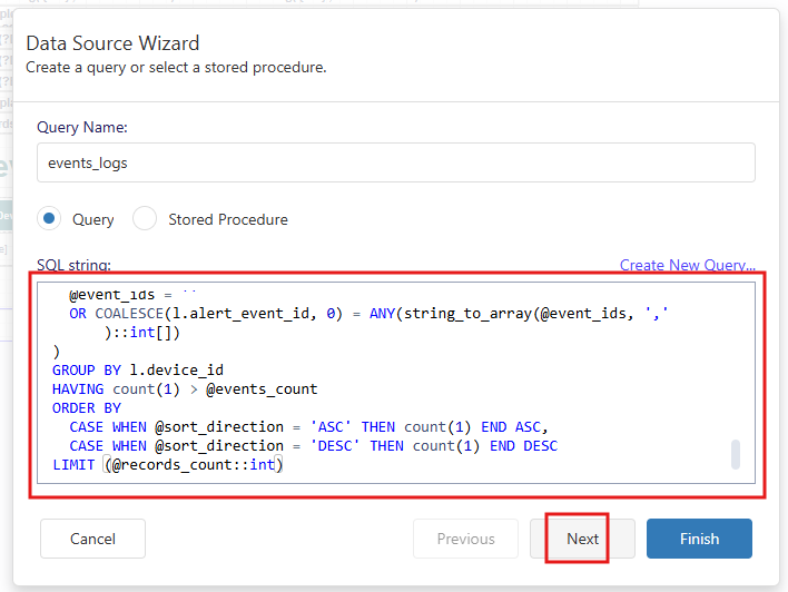 In the Data sources section, select the events_logs table and open the Data Source Wizard.