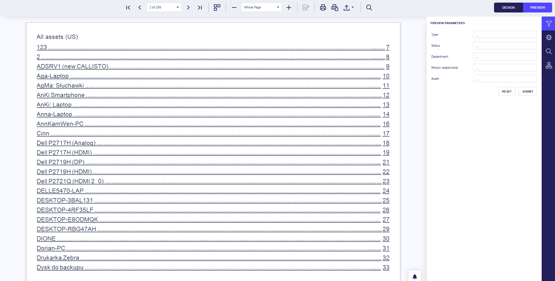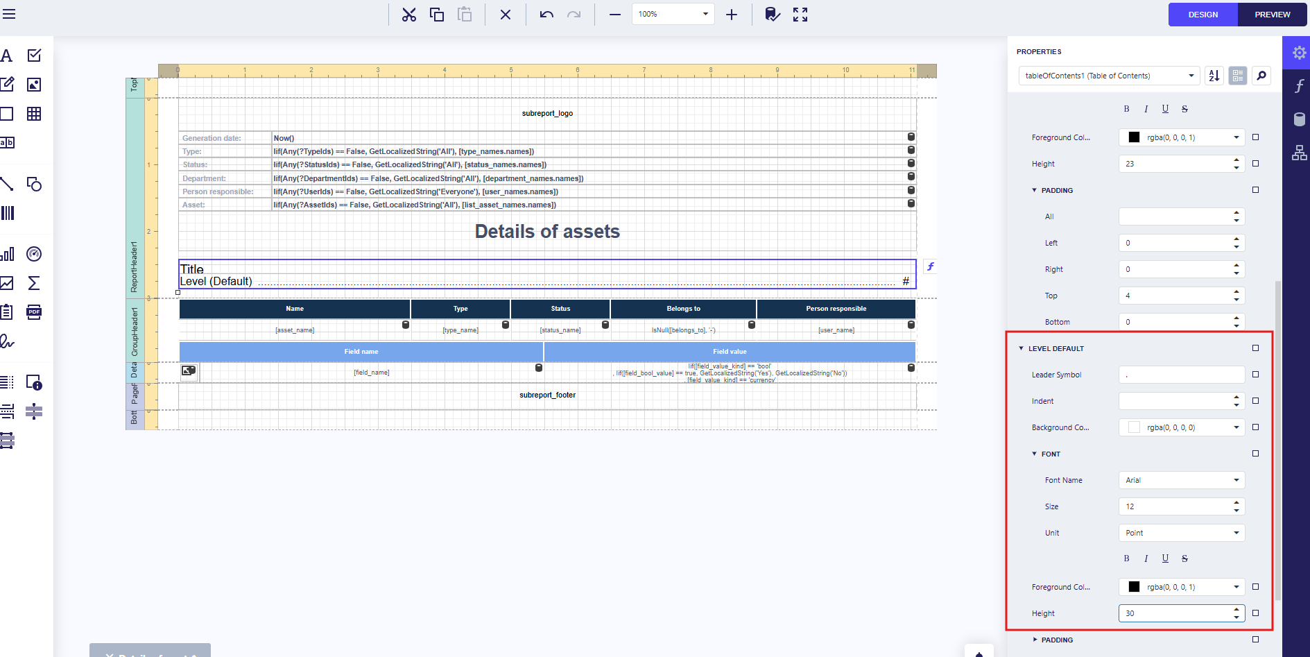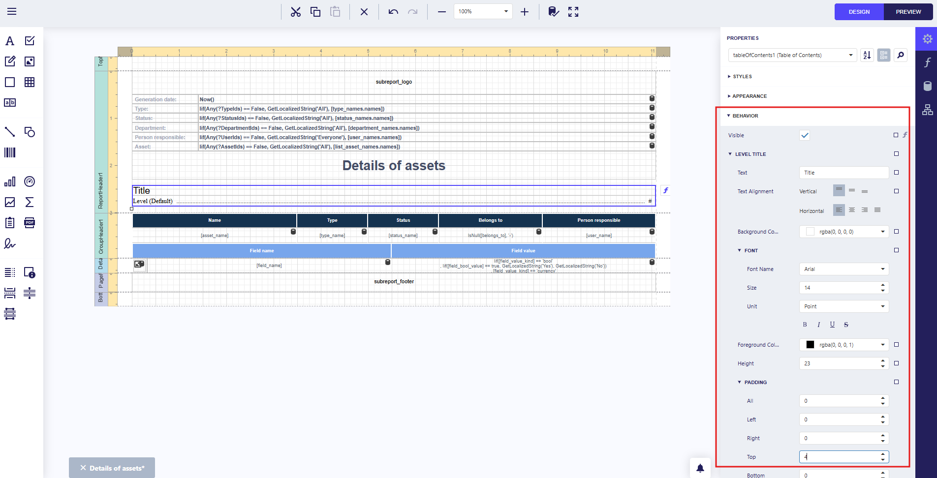 Add a table of contents to the report Asset Details.