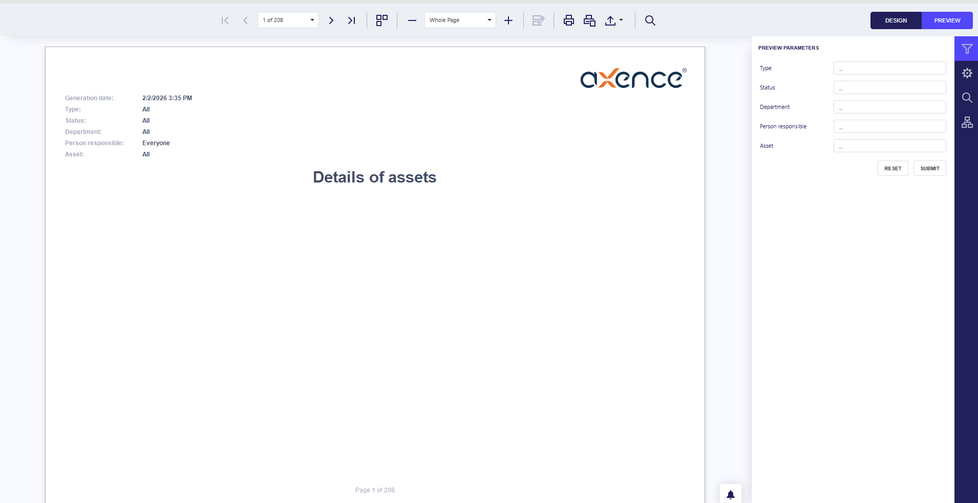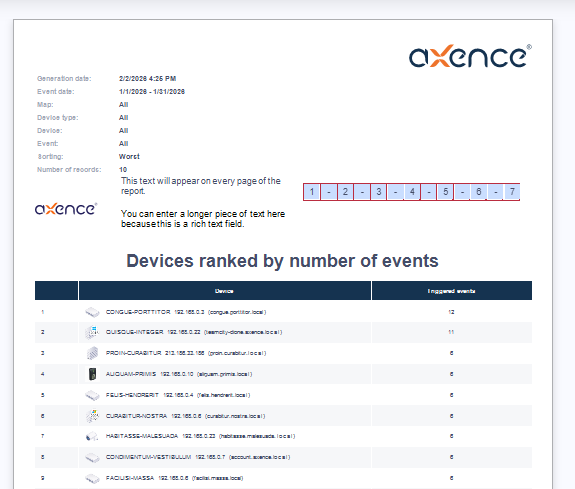 | Report header | Section displayed once on the first page; includes logo, report name, metadata, and parameters |