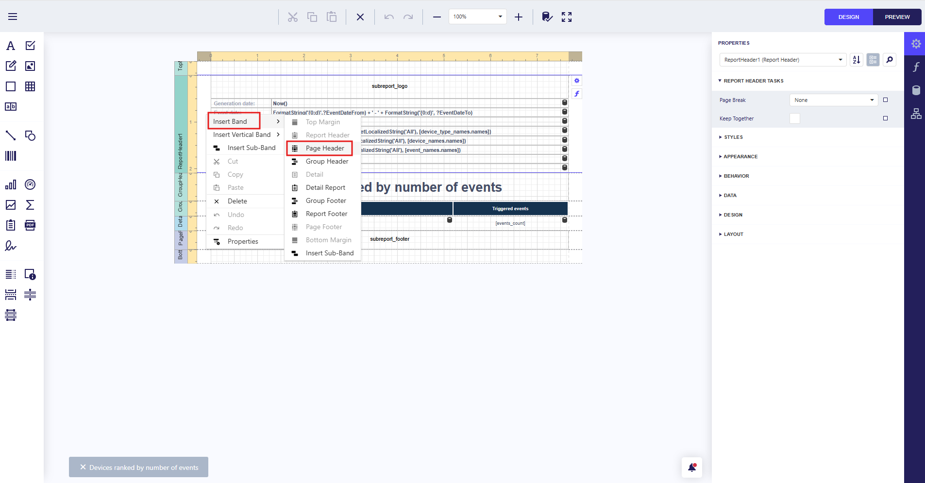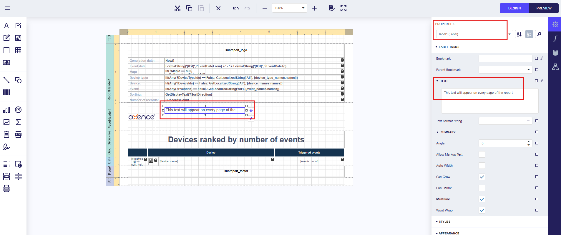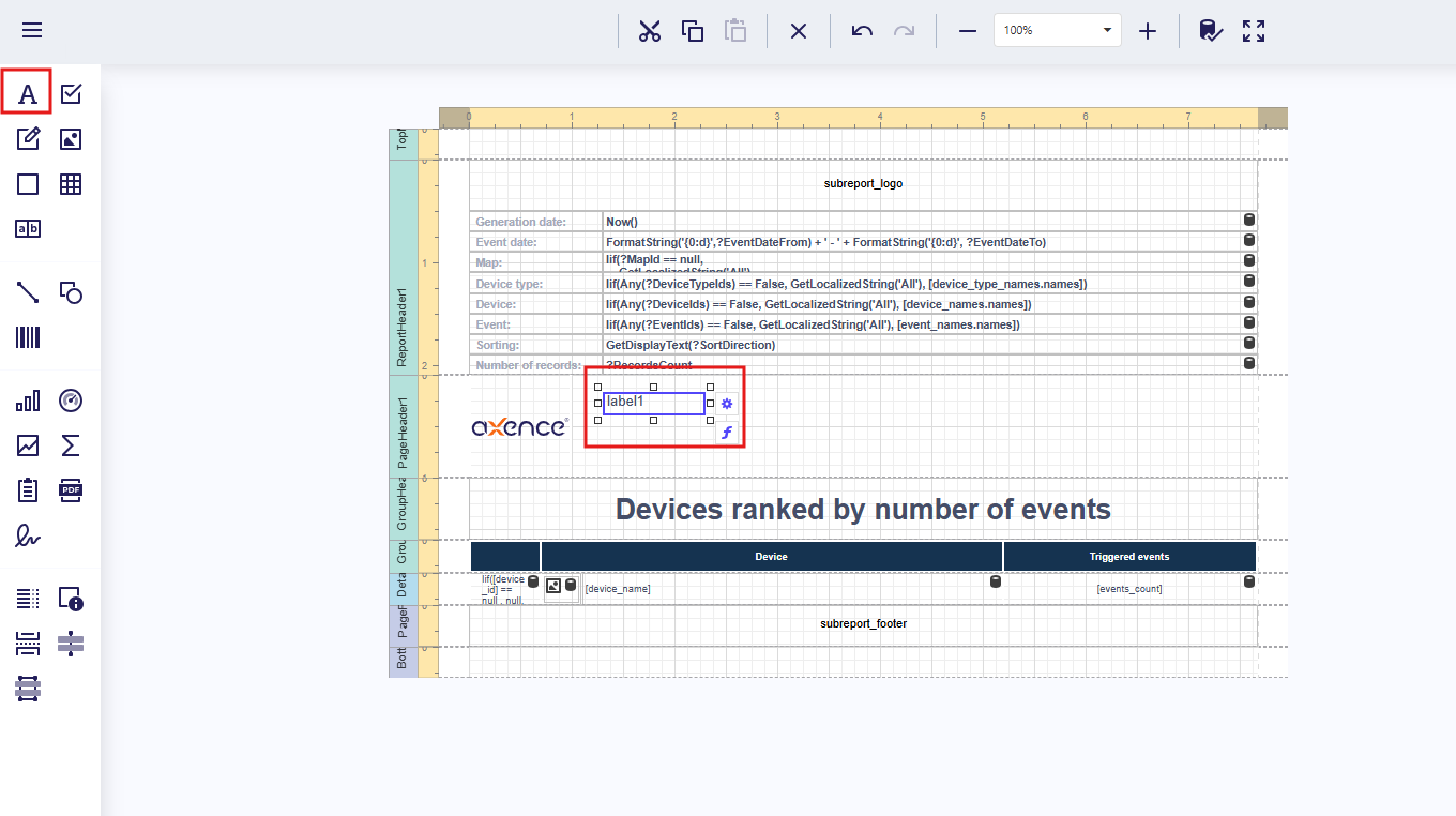 | Report footer | Used for summaries and conclusions; displayed once on the last page |