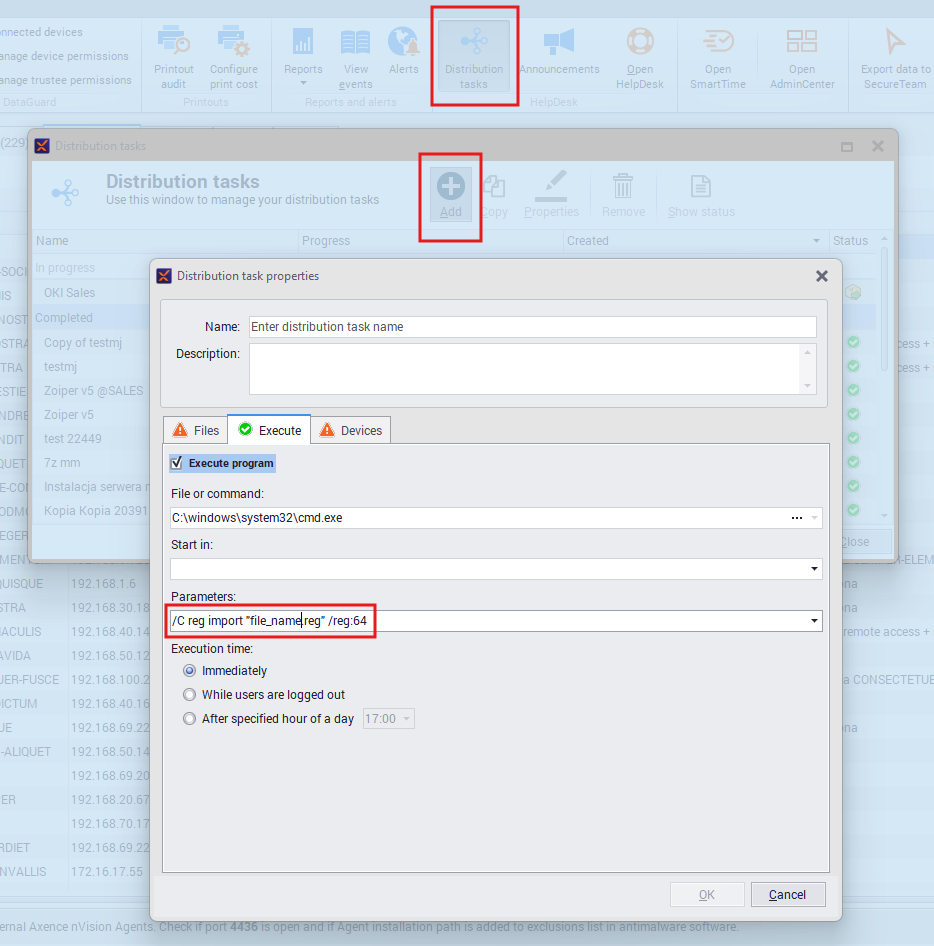 If you want to distribute and run .REG files on computers with Agents installed, use the distribution task feature. It allows you to upload files to Agent machines and import the registry.