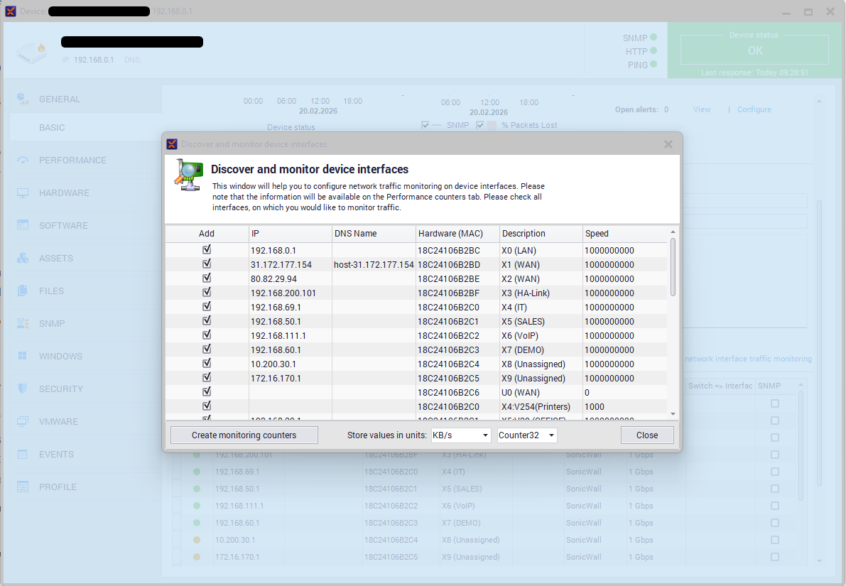 In the new window, select the interfaces for which traffic should be monitored. Confirm by clicking Create counters.