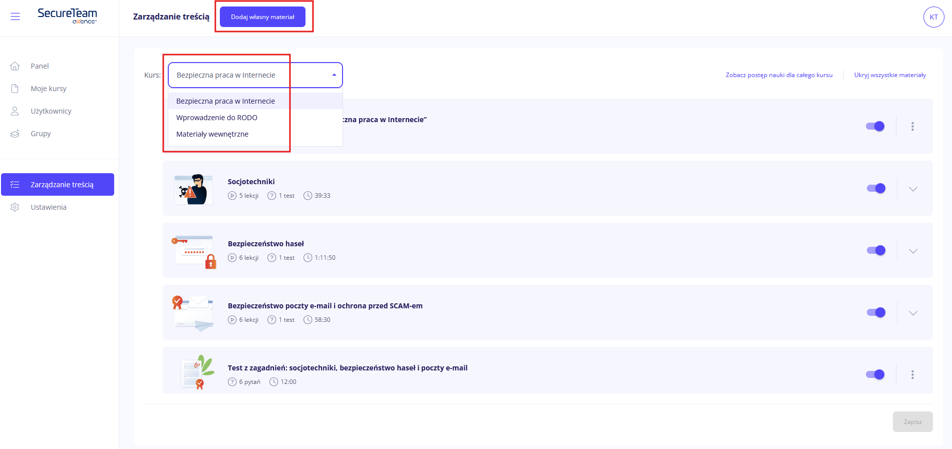 Materiał własny pojawia się na samym końcu kursu. Przeciągając elementy, możesz zmienić kolejność własnych materiałów, ale już nie - wbudowanych treści szkoleniowych. Zmianę kolejności zatwierdzisz, klikając w przycisk Zapisz.