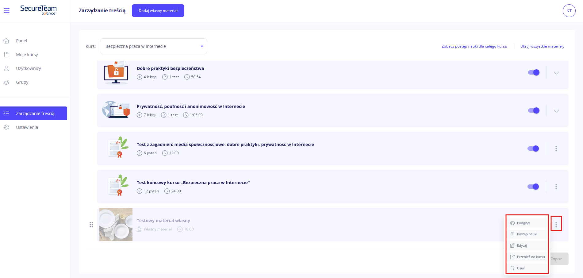 Własne materiały możesz edytować, usuwać, a także przenosić między kursami. Usunięcie własnego materiału jest nieodwracalne.