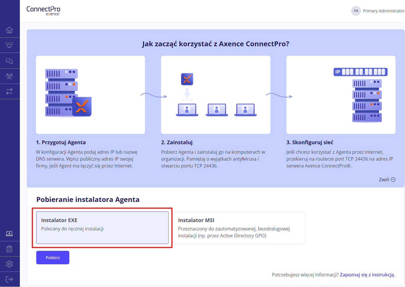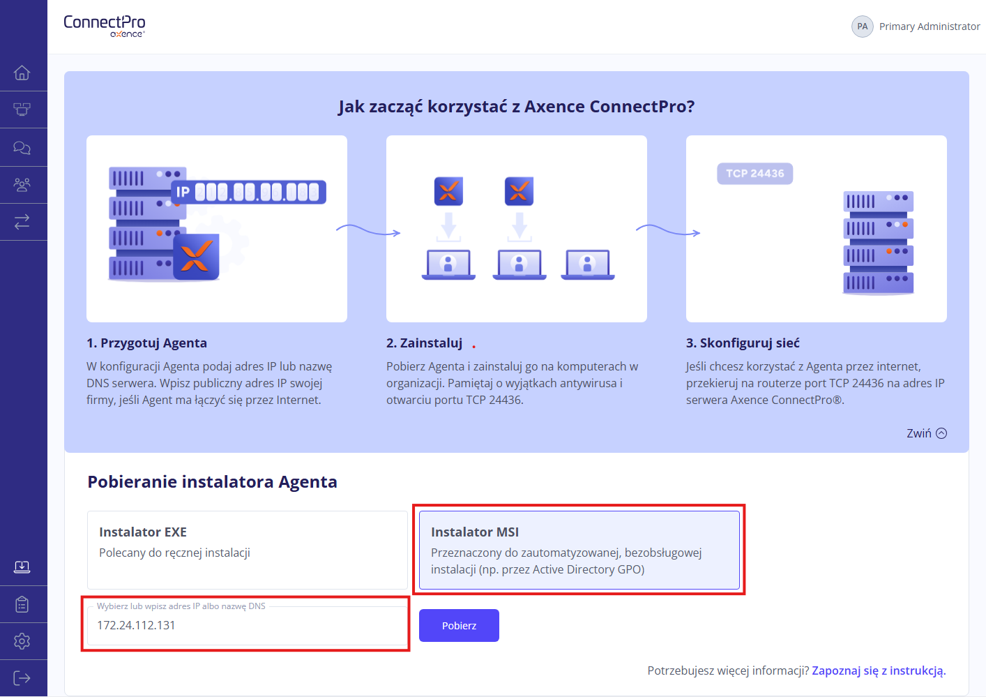 instalator MSI - do instalacji zautomatyzowanej (rekomendowanej) z publicznym adresem IP brzegowego routera twojej organizacji. Swój publiczny adres IP możesz sprawdzić tutaj. Adres IP może być tu lokalnym adresem komputera z działającym na nim serwerem ConnectPro, ale tylko w przypadku Agentów na urządzeniach w sieci lokalnej. Jeśli dany komputer zostanie podłączony poza siedzibą firmy, Agent nie będzie działał.