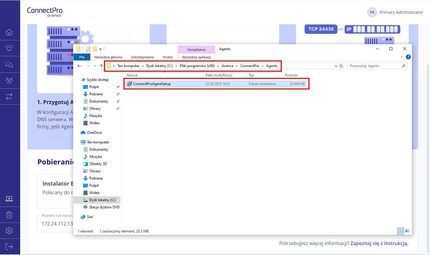 Po kliknięciu w przycisk Pobierz instalator ściągnie i zapisze się automatycznie w lokalizacji C:\Program Files (x86)\Axence\ConnectPro\Agents - folder z zapisanym plikiem otworzy się automatycznie.