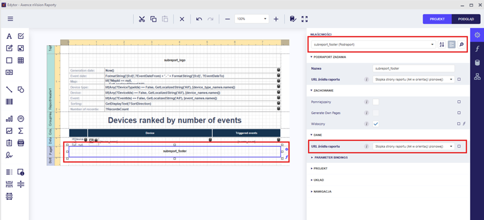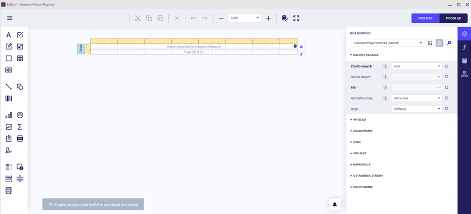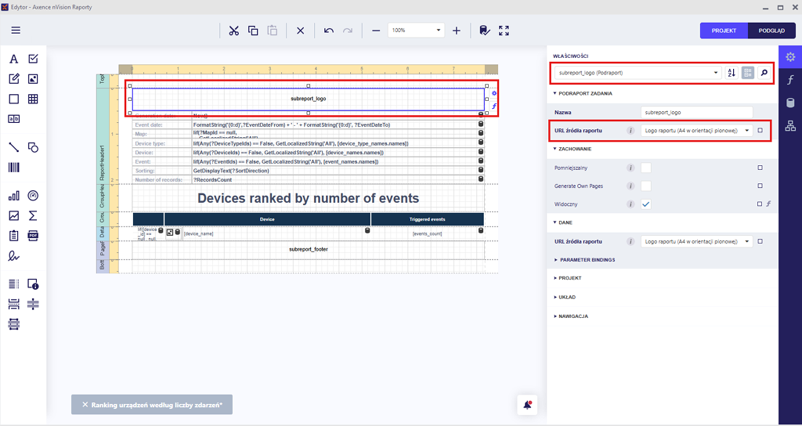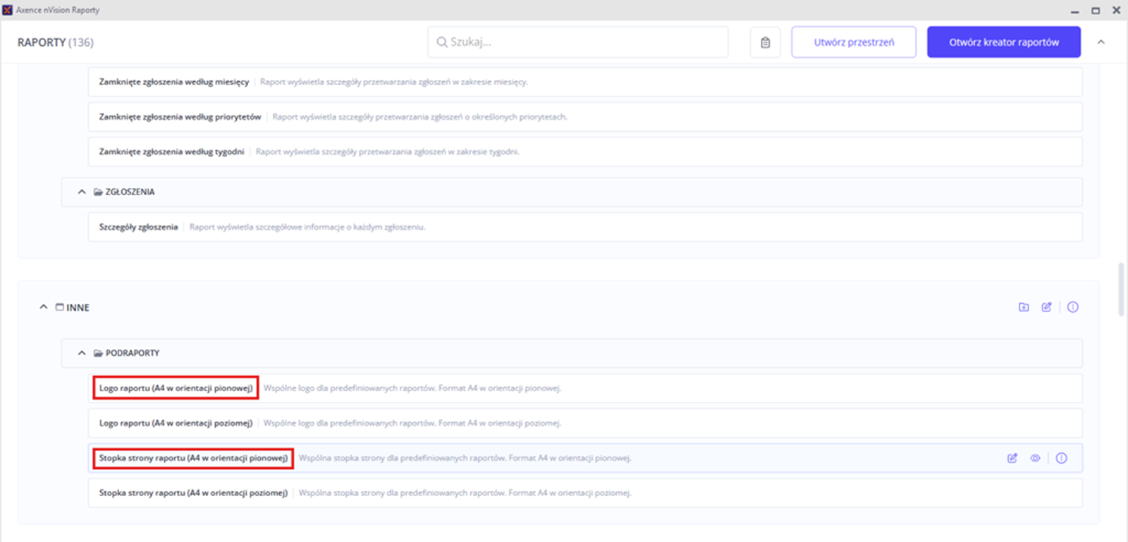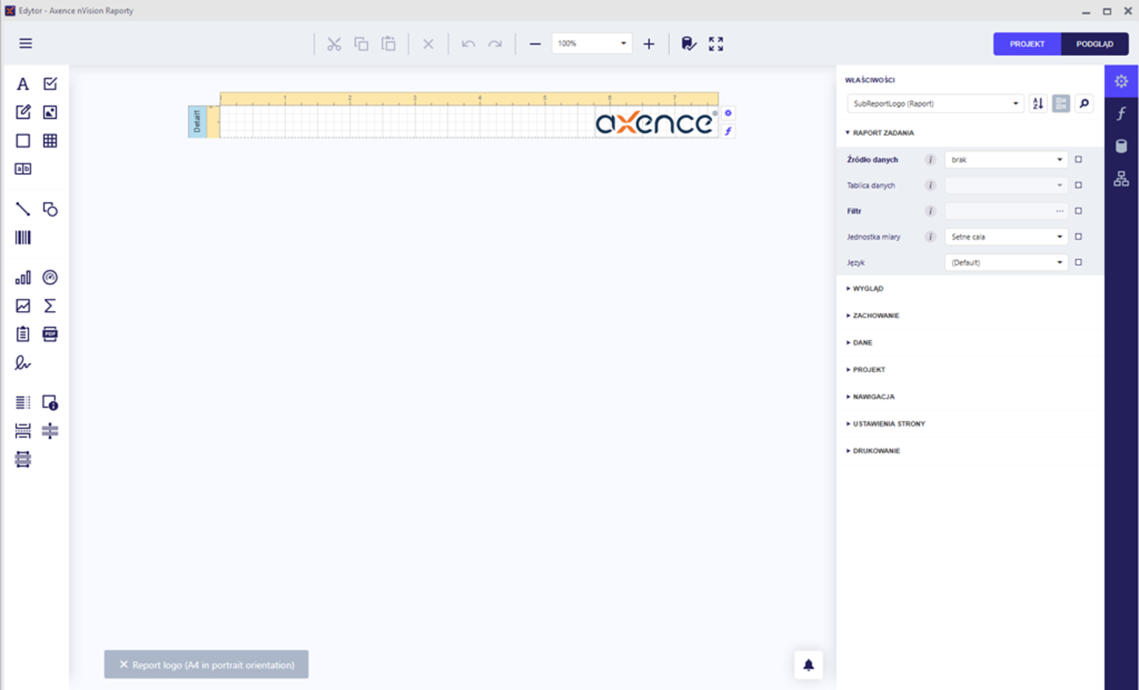 W tej sekcji, w folderze Podraporty, znajdziemy projekt logo i stopki (w wersjach pionowej i poziomej orientacji raportu). Są one wykorzystywane we wbudowanych raportach i mogą być również użyte przy tworzeniu raportów własnych.