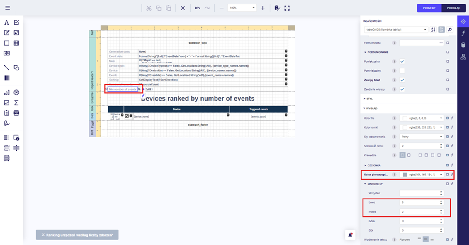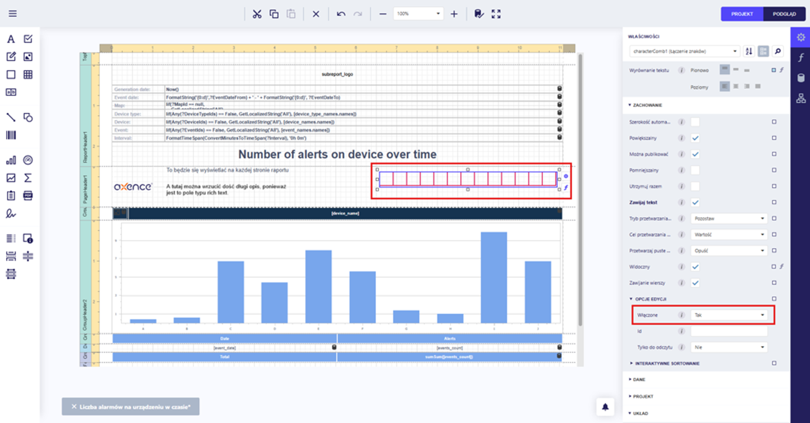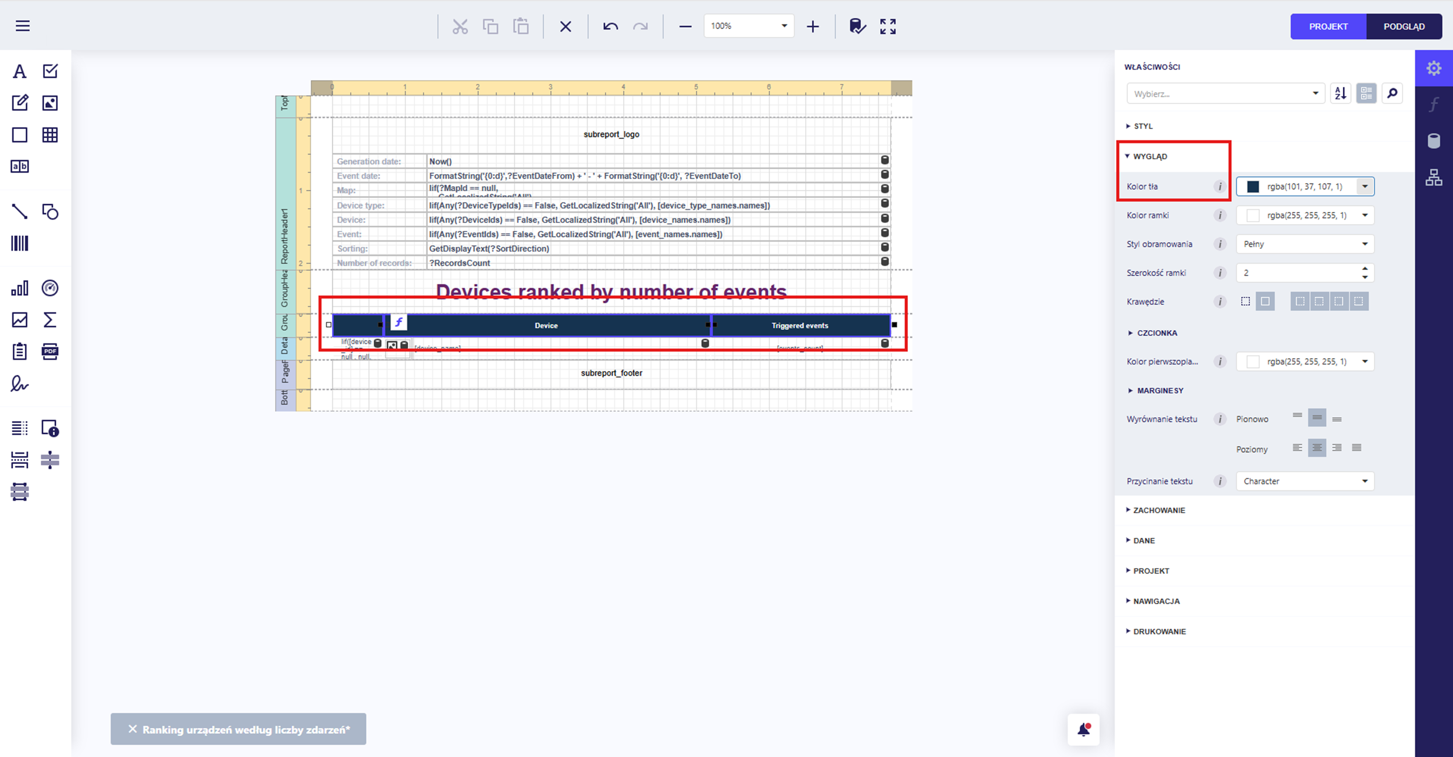 Poszczególne części raportu można edytować - dostosowywać ich rozmiar, zmieniać czcionkę, kolor tła, układ, etc.