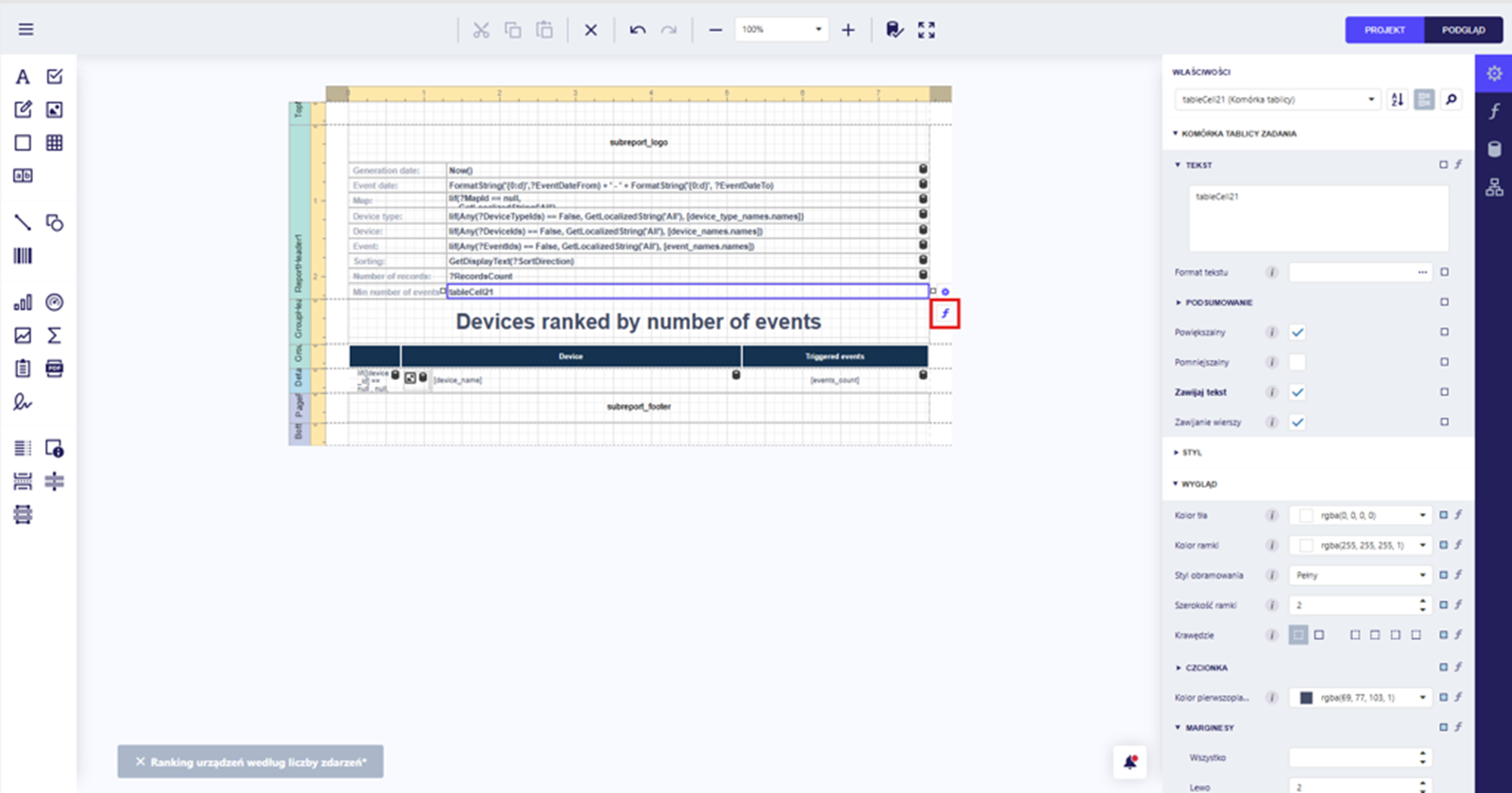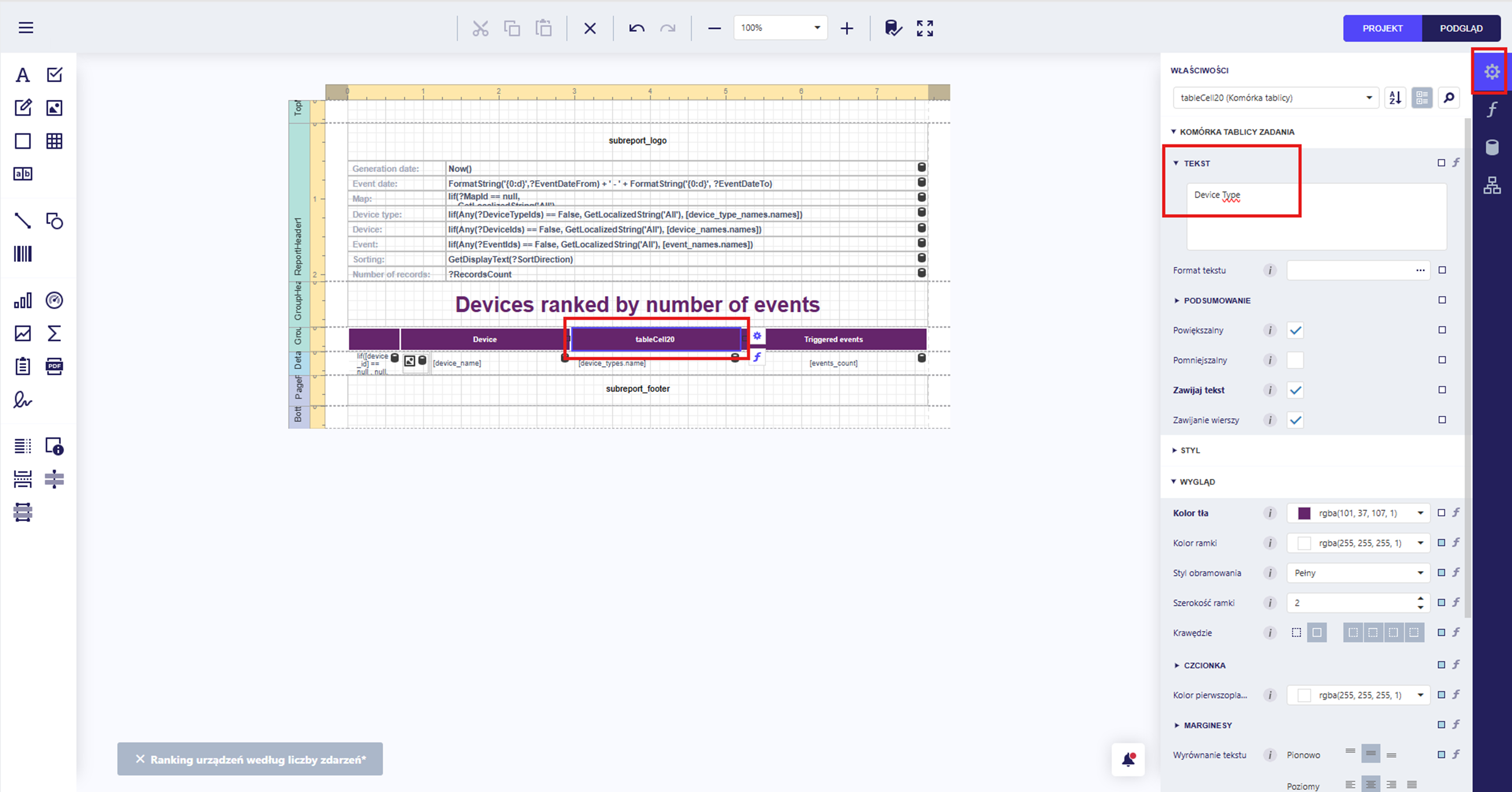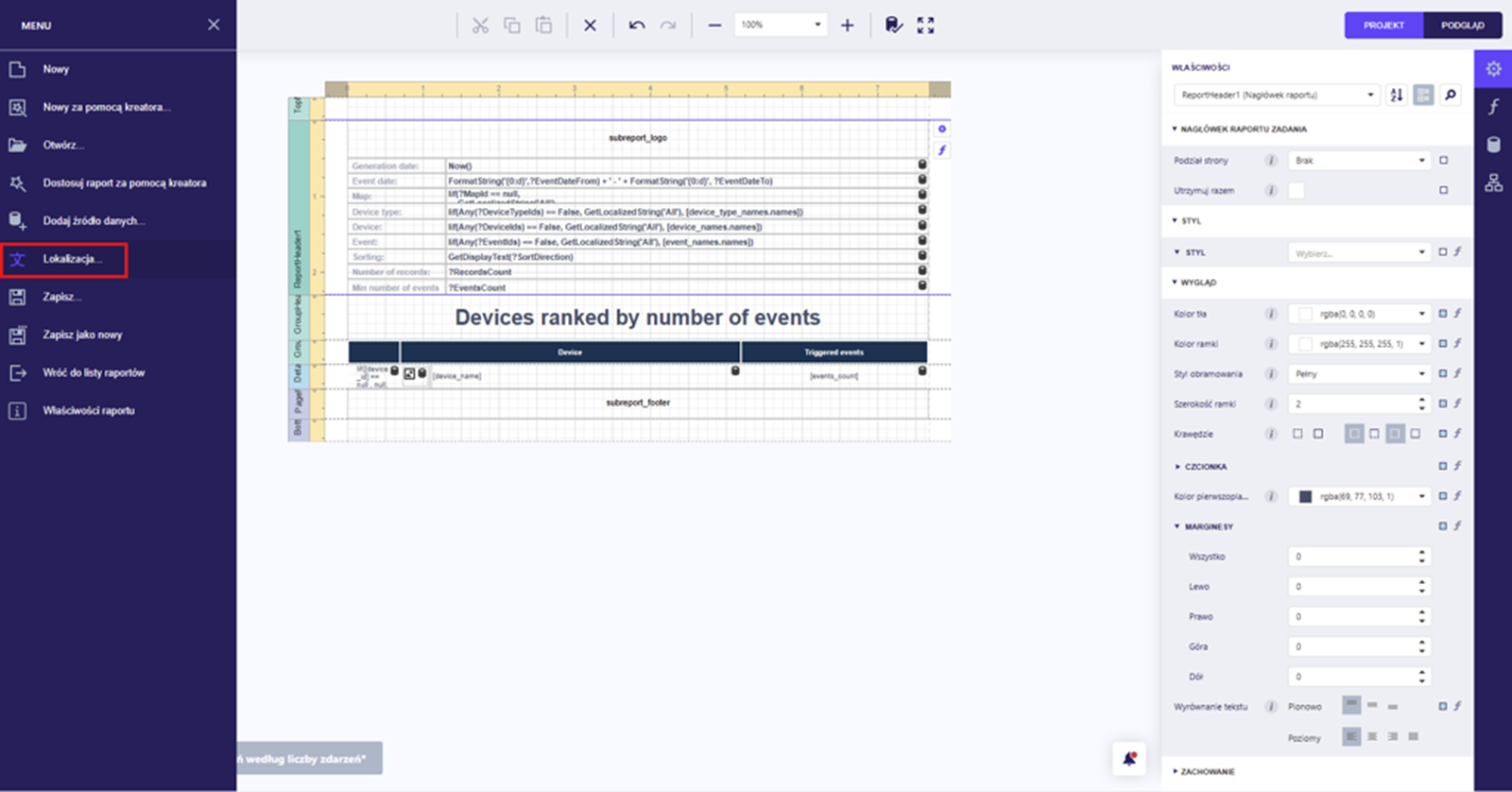 Poszczególne części raportu można edytować - dostosowywać ich rozmiar, zmieniać czcionkę, kolor tła, układ, etc.