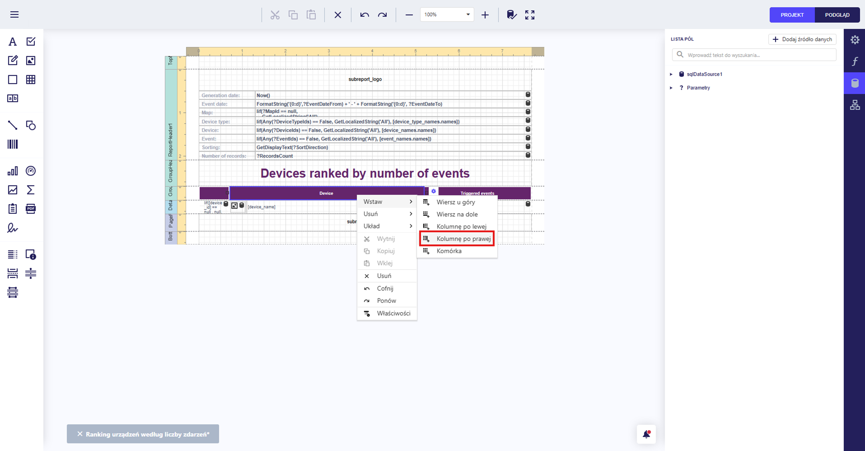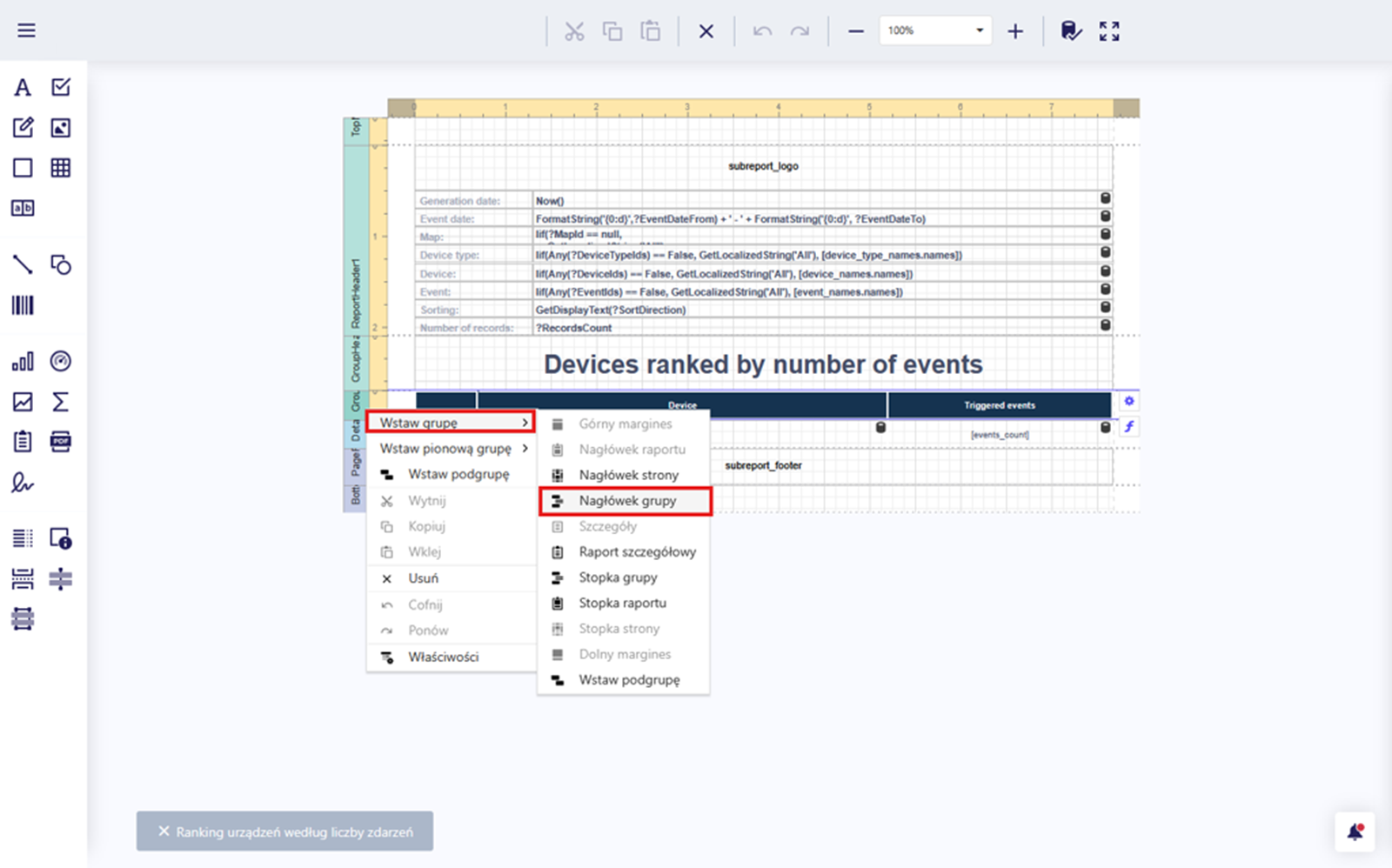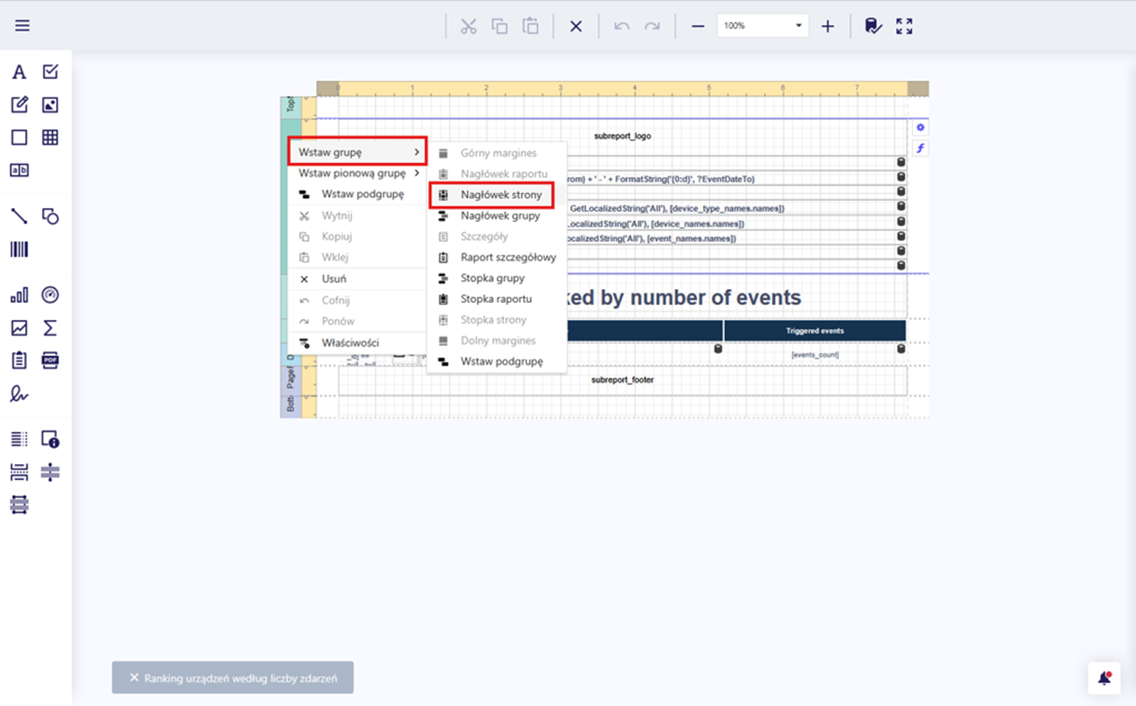 Kliknij w dowolny element wybranego raportu i z menu dostępnego pod prawym przyciskiem myszy znajdź Wybierz grupę > Nagłówek strony.