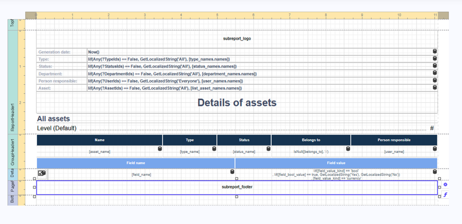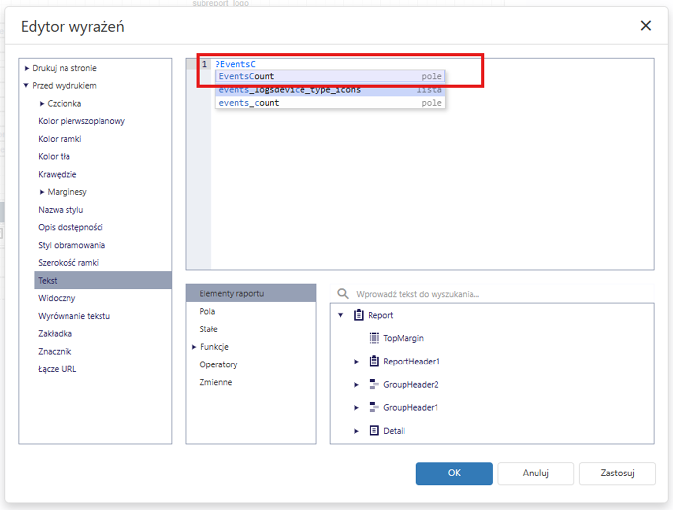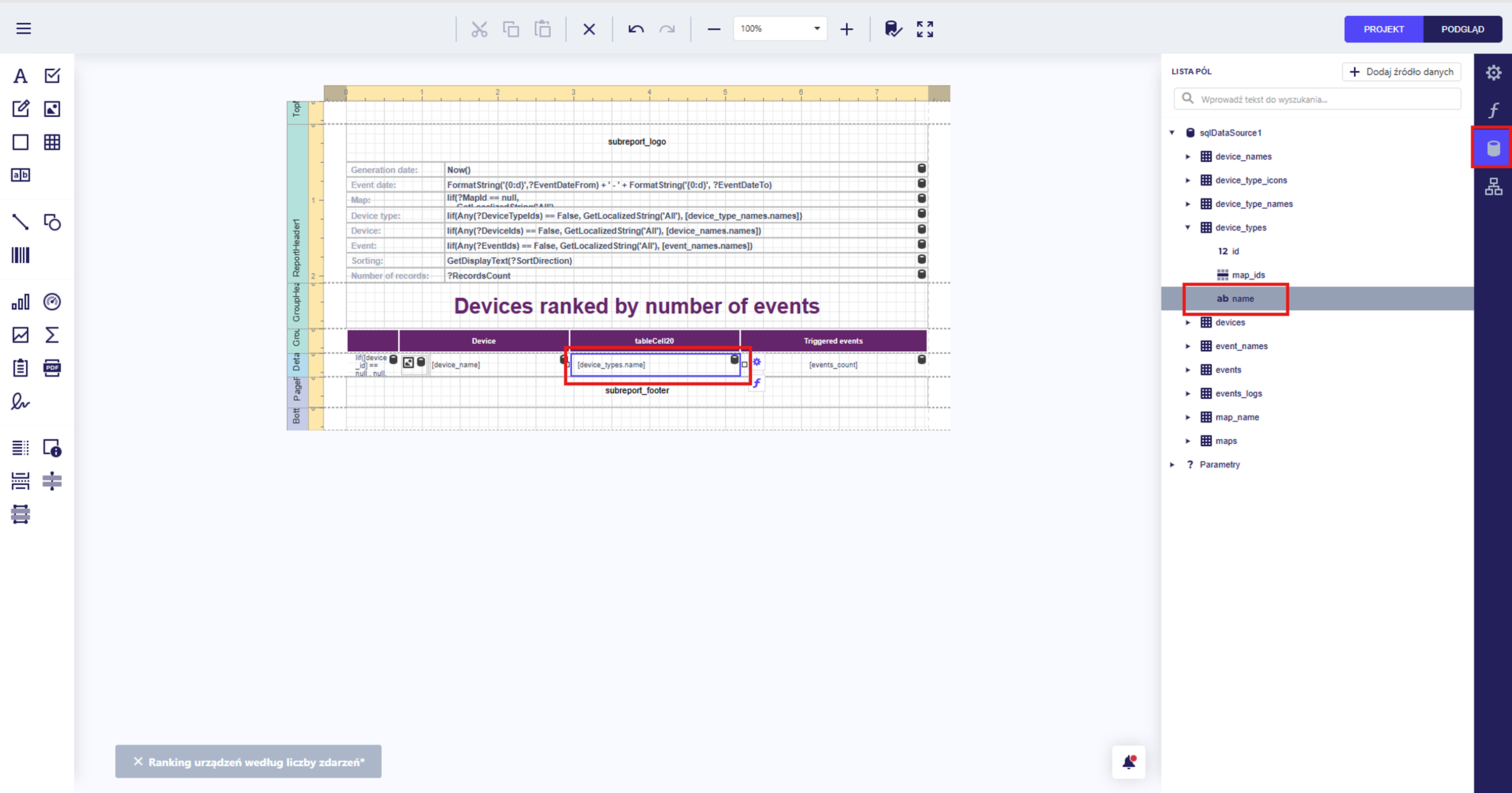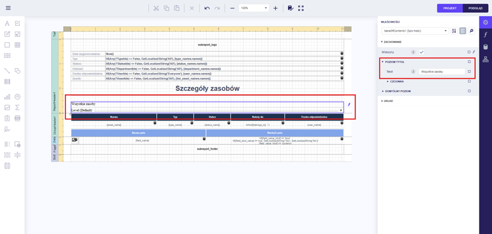 | nagłówek grupy | powtarzany dla każdej z grup (i podgrup), pozwala na wyświetlanie danych z dynamicznego źródła |