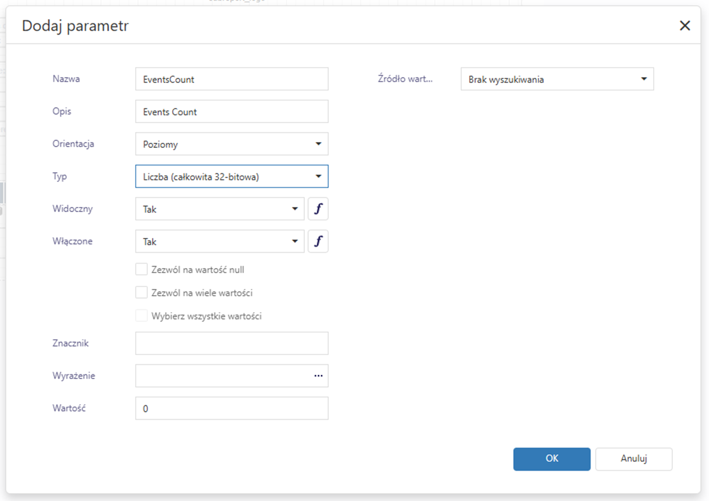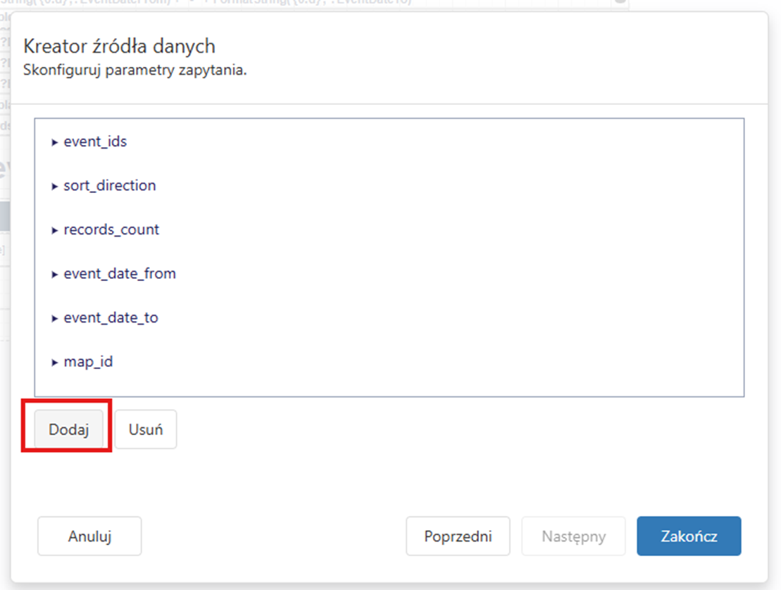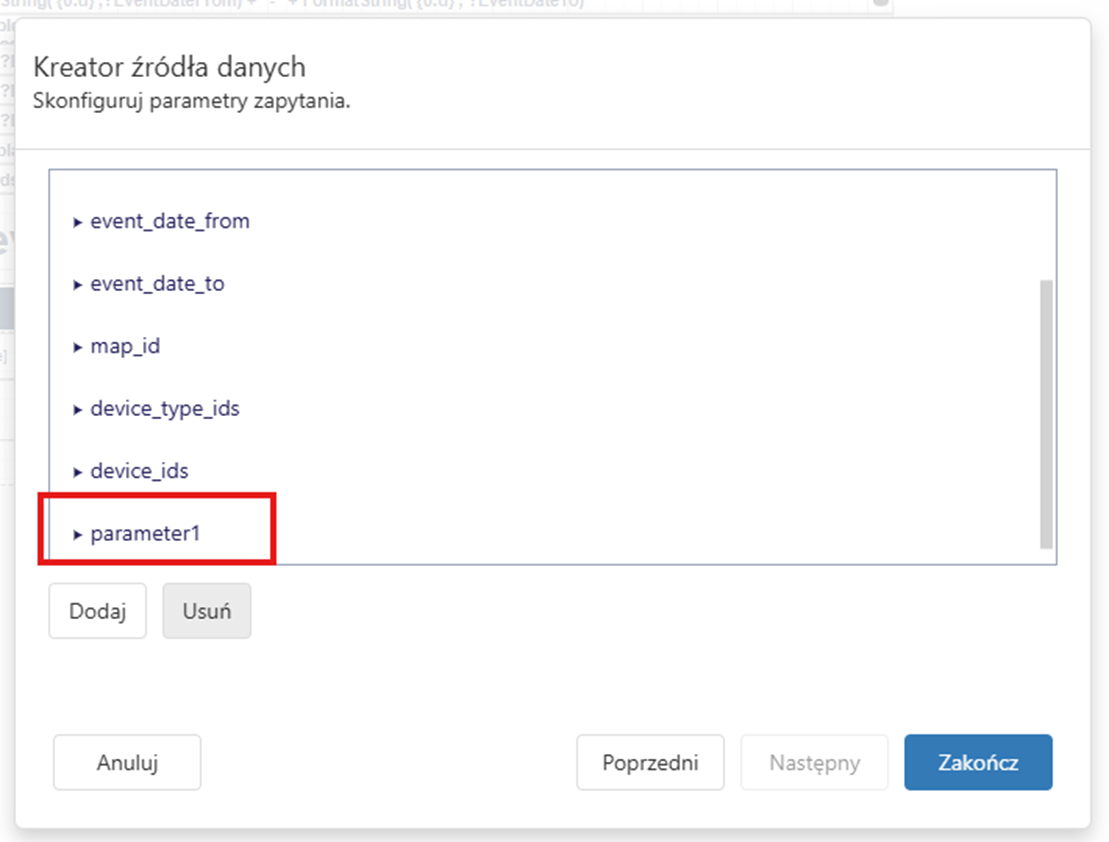 W zakładce Dane panelu po prawej stronie, w sekcji Parametry, otwórz formularz nowego parametru raportu (o parametrach raportu i parametrach zapytania więcej przeczytasz w artykule o Kreatorze).
