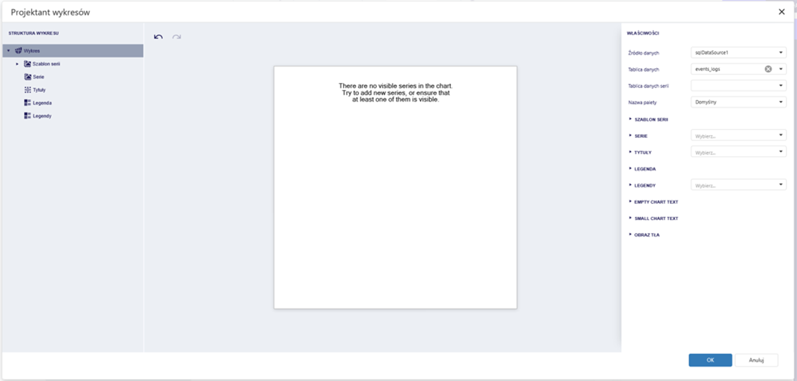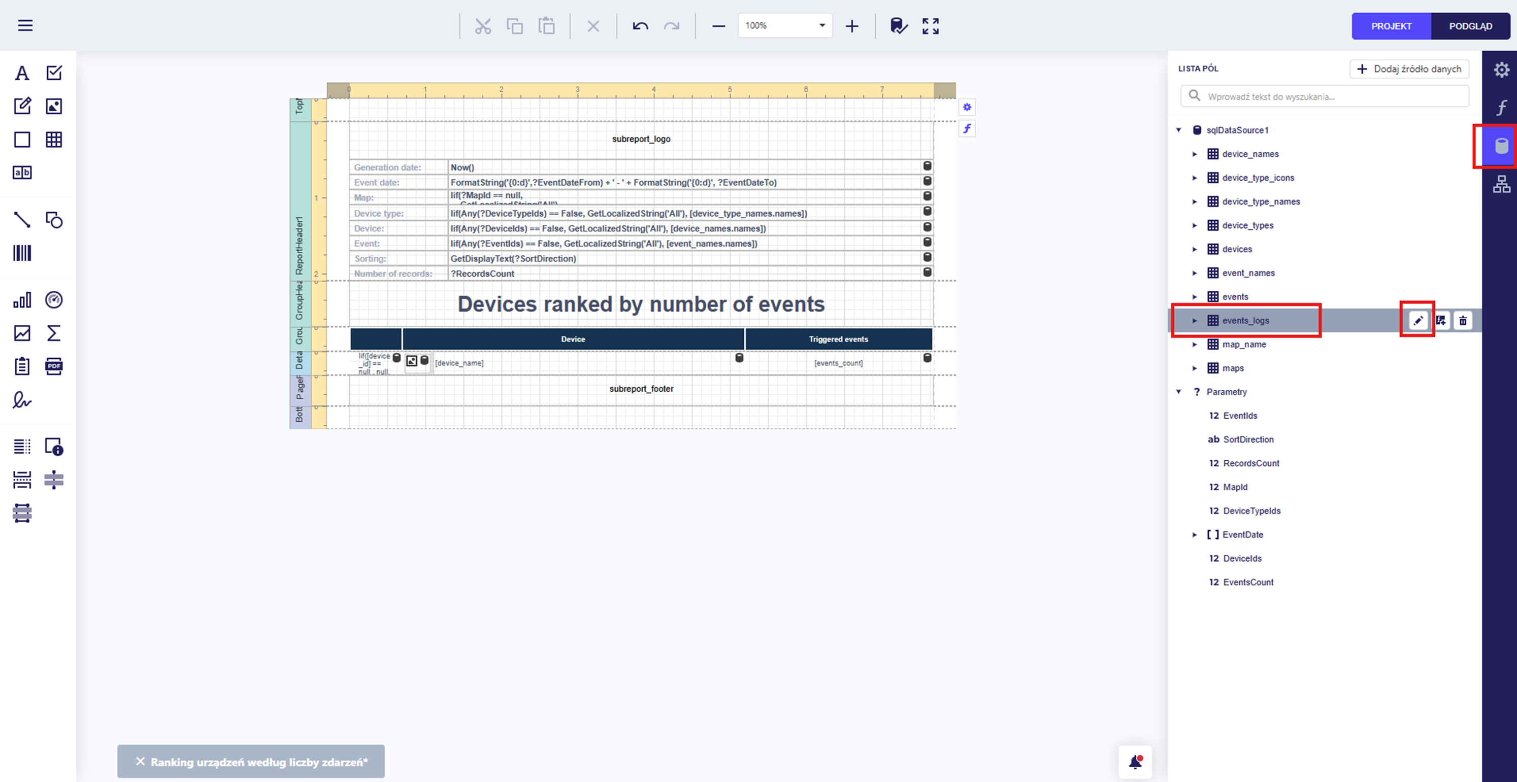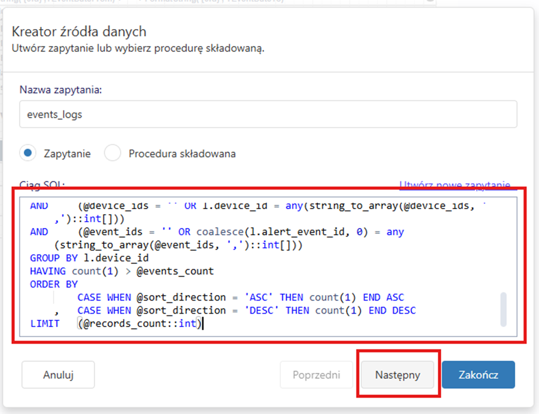 W zakładce Dane panelu po prawej stronie, w sekcji źródła danych, wybierz tabelę events_logs i otwórz okno kreatora źródła danych.