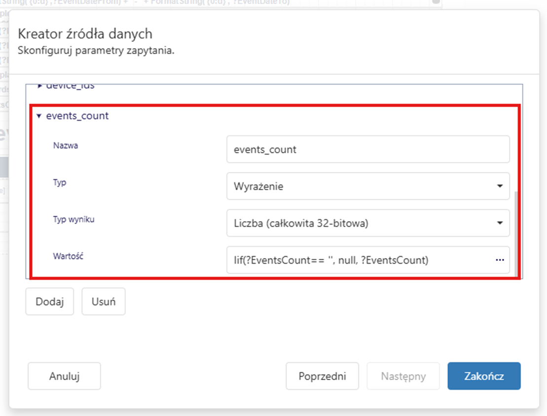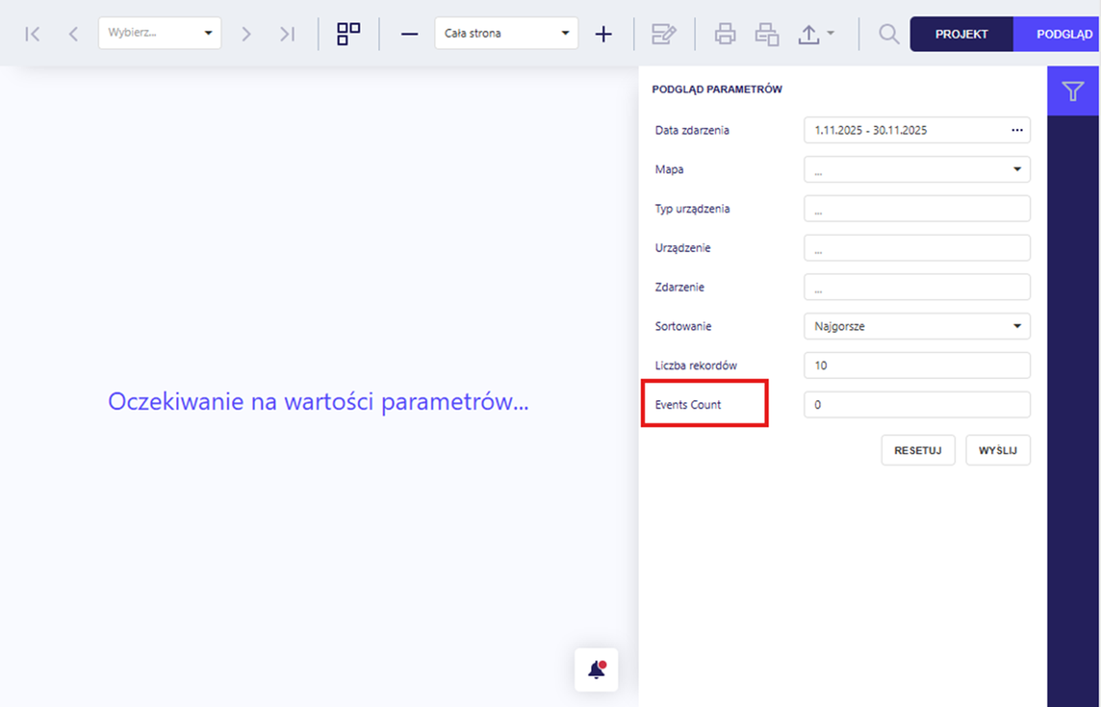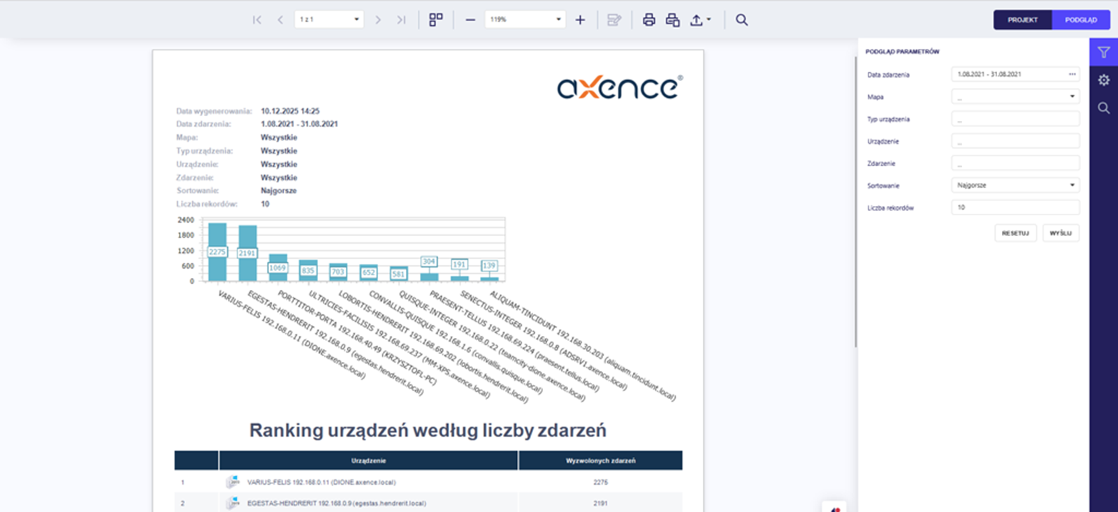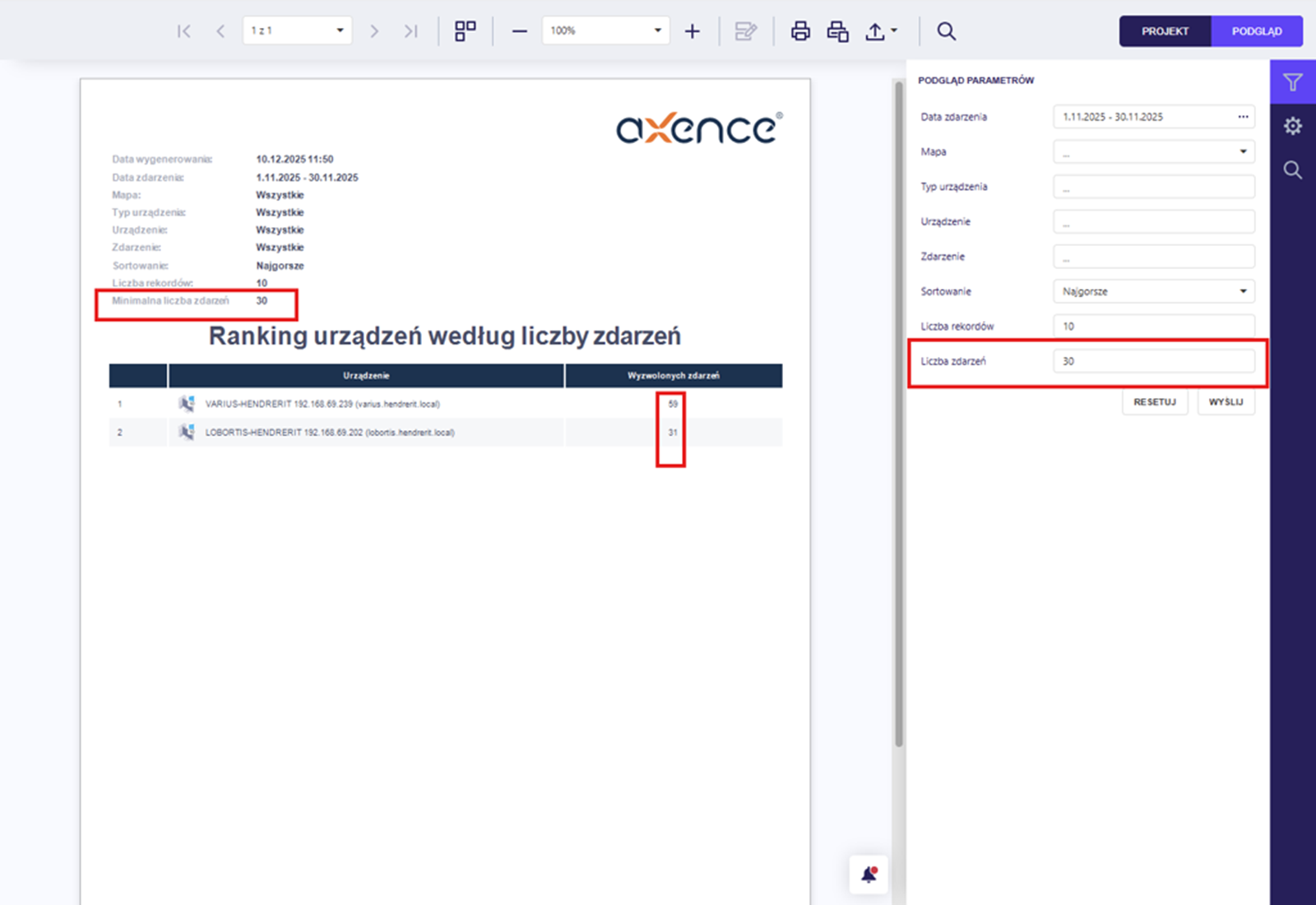 Cel: do raportu Ranking urządzeń według liczby zdarzeń dodać parametr wskazujący minimalną liczbę zdarzeń, jaka została wywołana na urządzeniu, żeby urządzenie pojawiło się w wynikach.