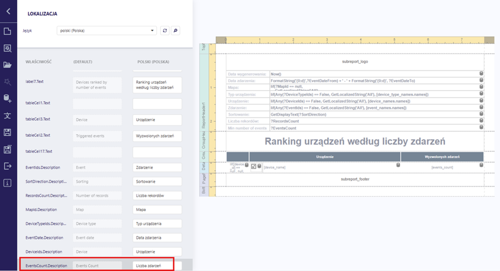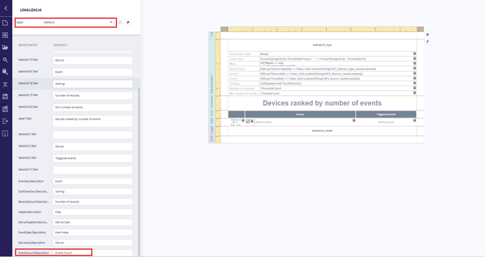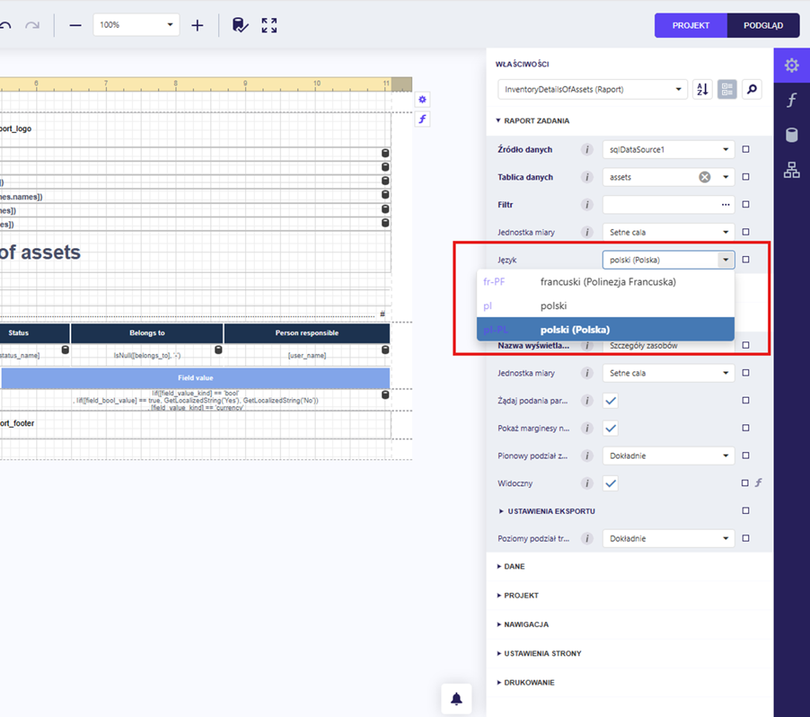 dostosuj ogólne właściwości raportu dla danego języka korzystając z dostępnych ustawień: