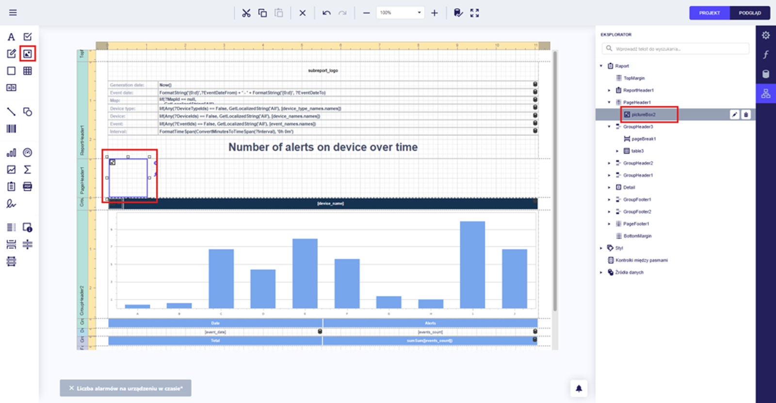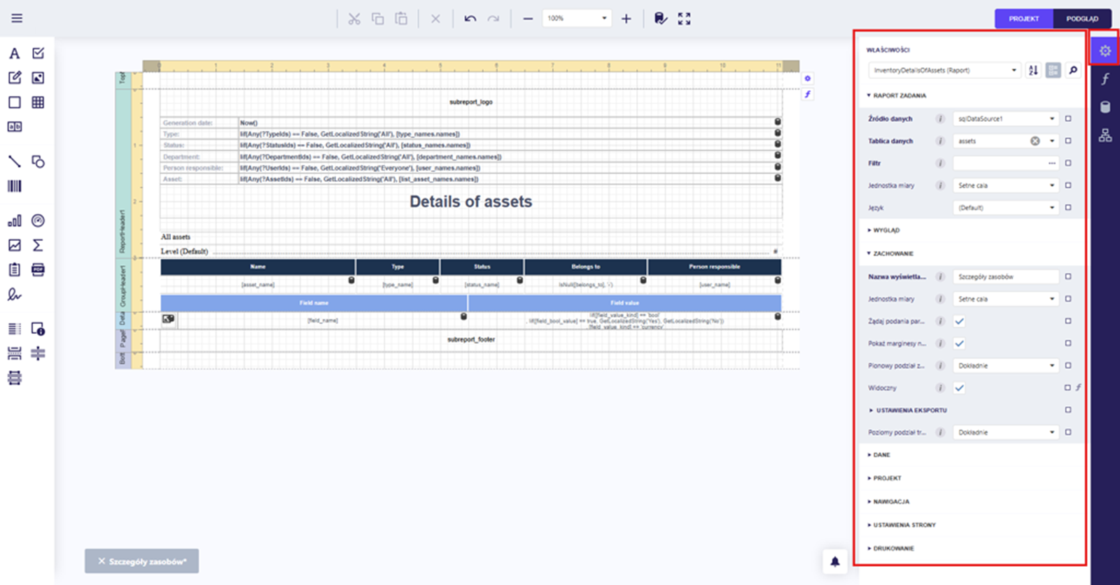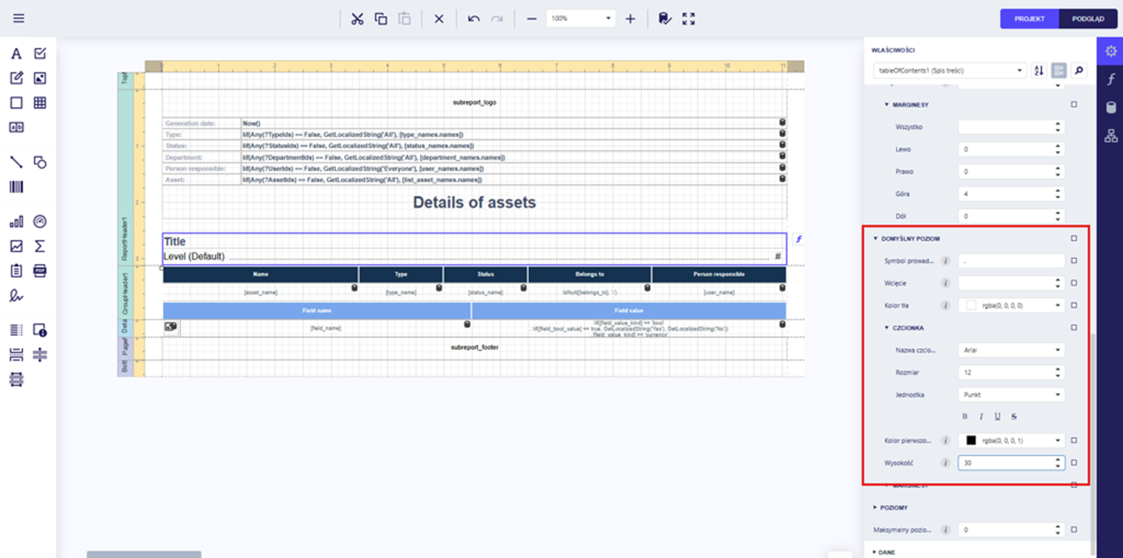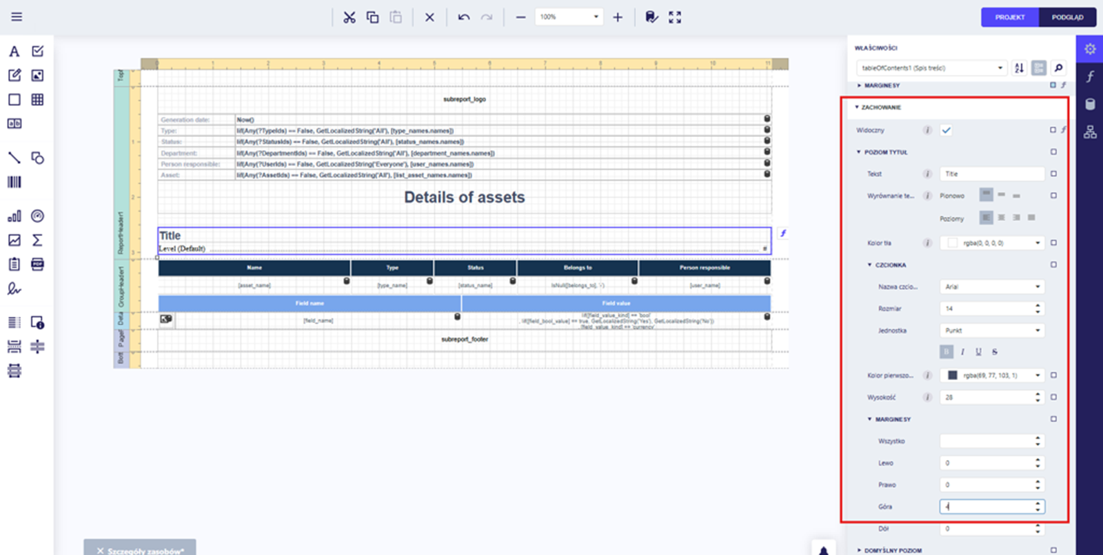 Cel: do raportu dodać sekcję, która będzie powtarzała się na każdej stronie. Sekcja ma zawierać obrazek, tekst główny i poboczny oraz pola możliwe do uzupełnienia ręcznie, widoczne w wygenerowanym pliku PDF.