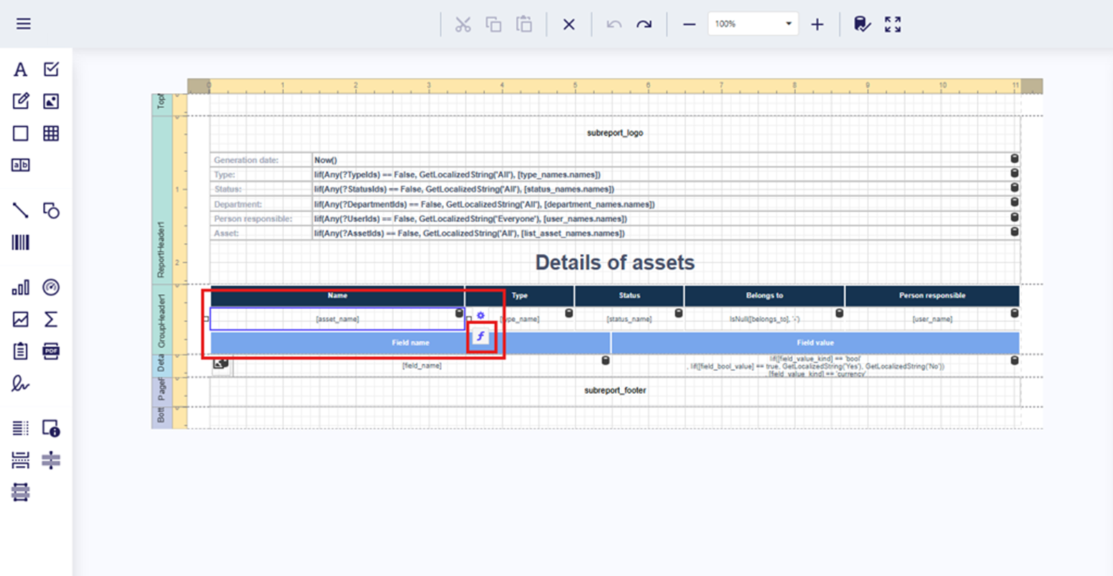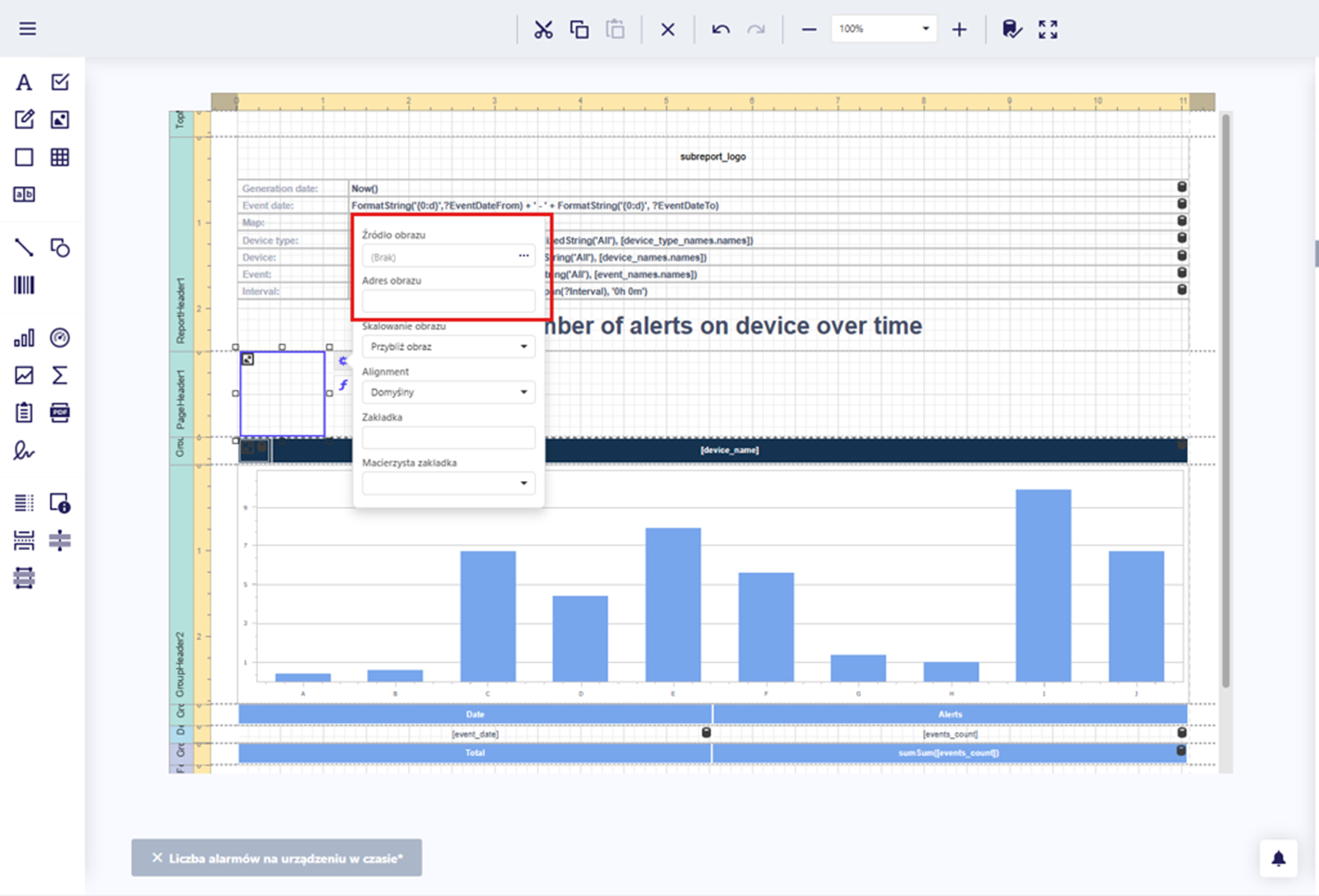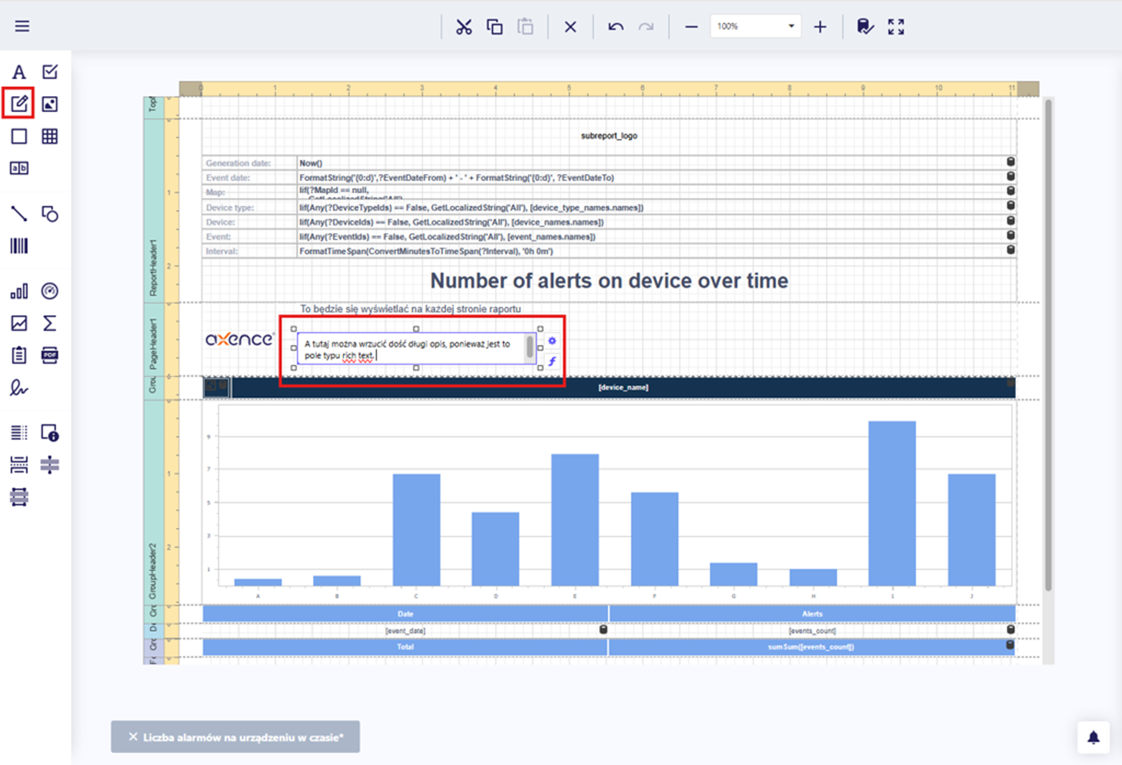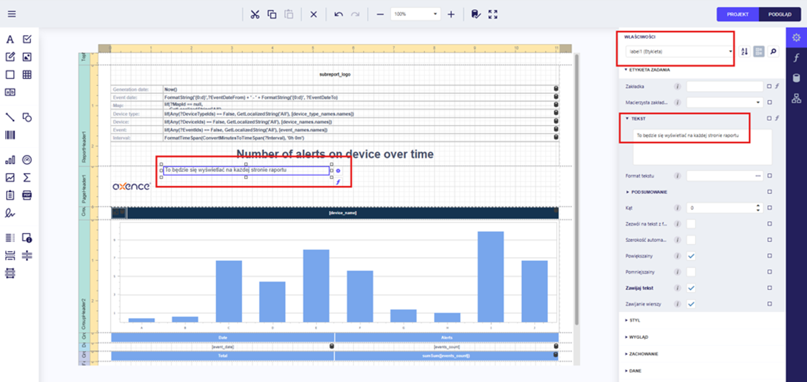 Cel: do raportu dodać sekcję, która będzie powtarzała się na każdej stronie. Sekcja ma zawierać obrazek, tekst główny i poboczny oraz pola możliwe do uzupełnienia ręcznie, widoczne w wygenerowanym pliku PDF.