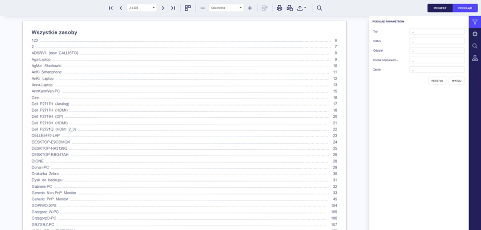 Cel: do raportu Szczegóły zasobów dodać spis treści.