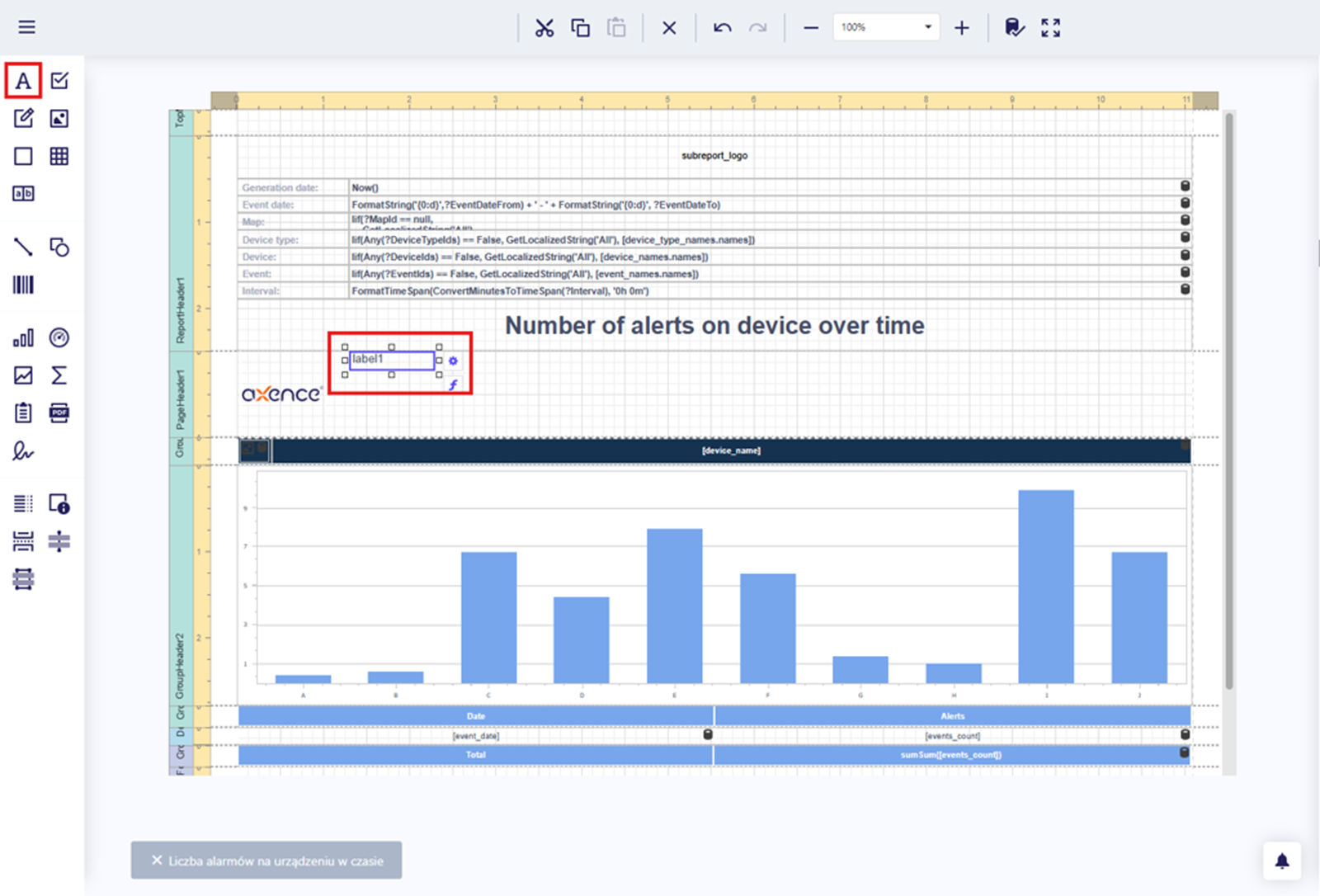 Przeciągnij ikonę Etykiety, by użyć jej do wstawienia tekstu głównego. Przeciągnij ikonę Tekstu formatowanego, by wstawić tekst poboczny. Dostosuj teksty, pamiętając o dodaniu ewentualnych wersji językowych. Pełne informacje o warstwie językowej raportów i tłumaczeniach znajdziesz tutaj.