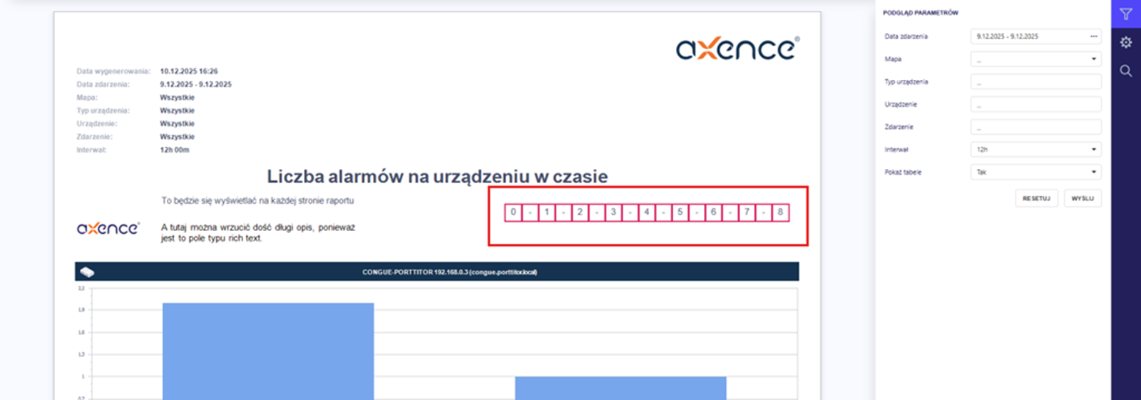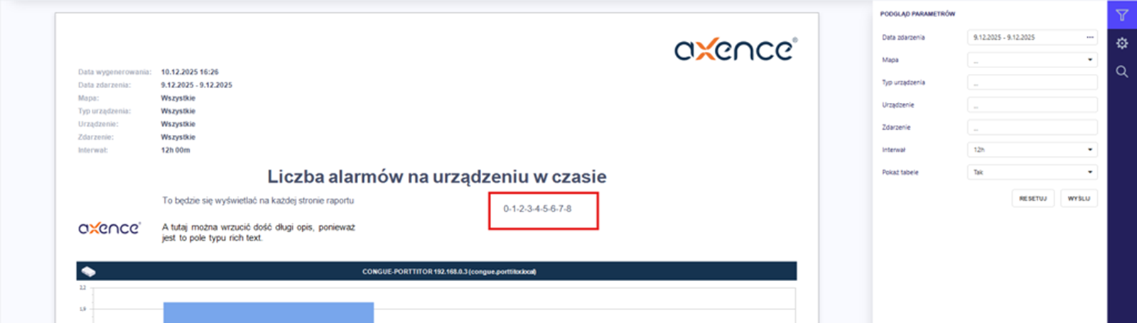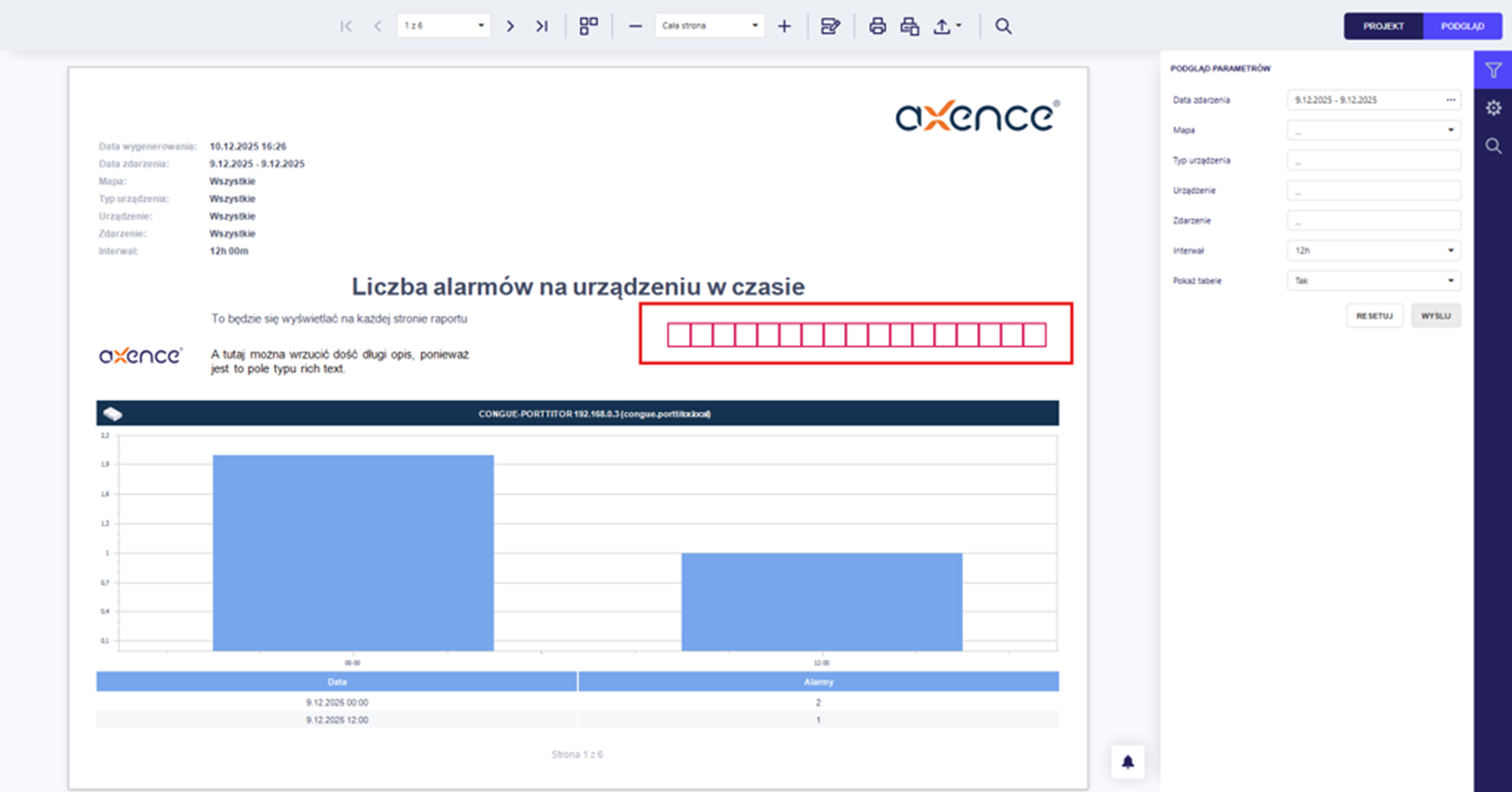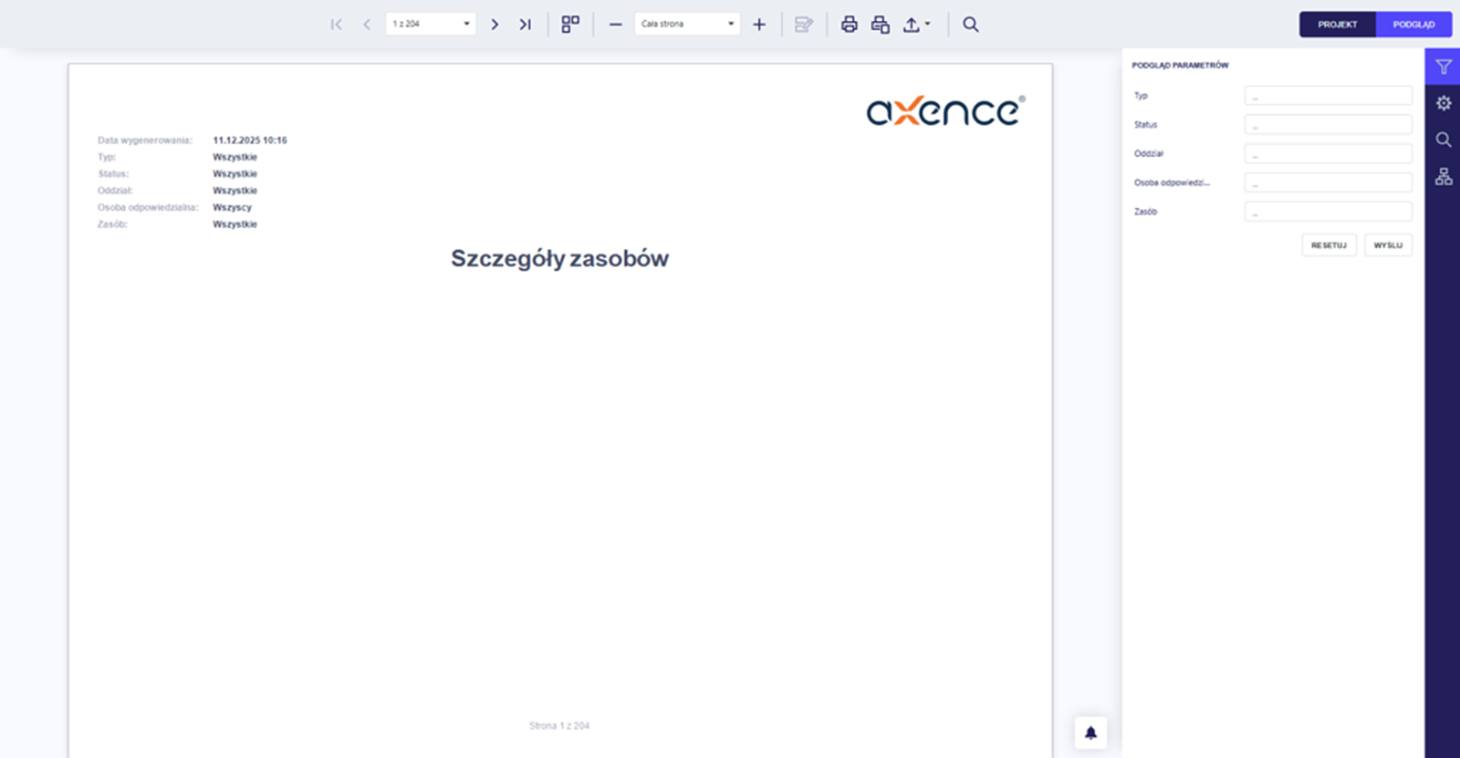| nagłówek raportu | widoczna sekcja przeznaczona do wyświetlenia logo, nazwy i metryczki raportu, a także parametrów, wyświetlana raz na pierwszej stronie |