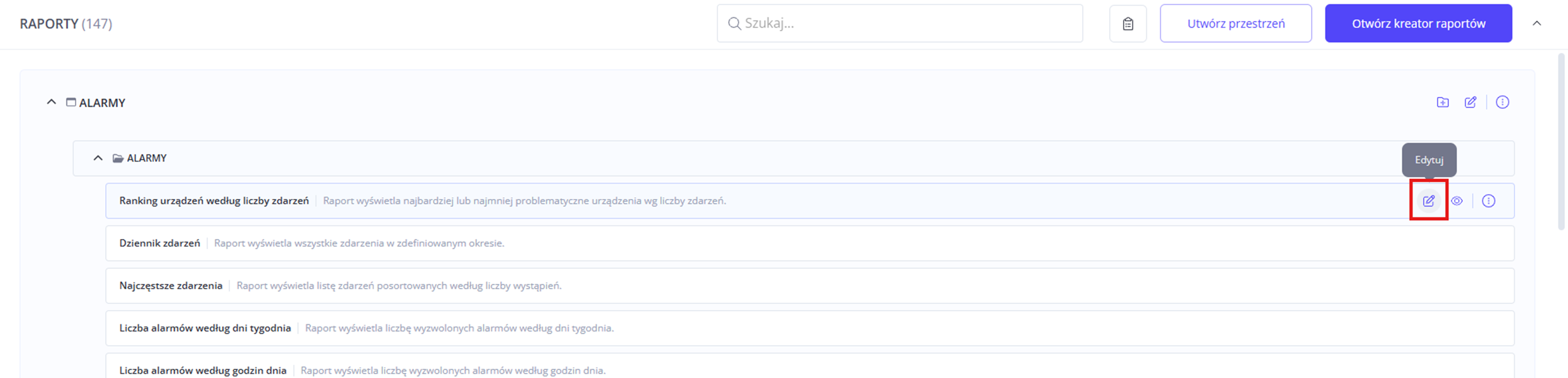 Każdy z dostępnych w systemie raportów można modyfikować. Robimy to z poziomu listy raportów, klikając w opcję Edytuj: