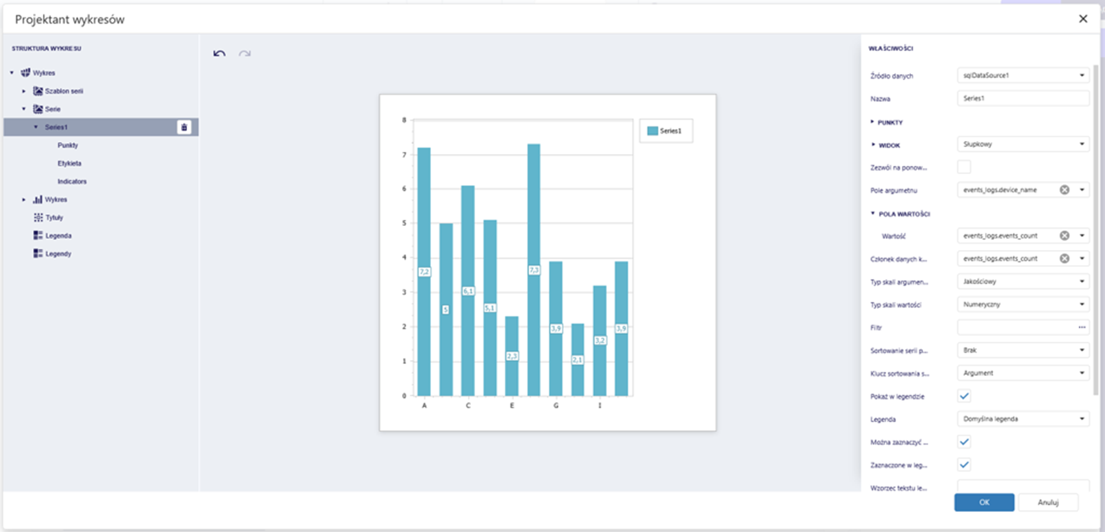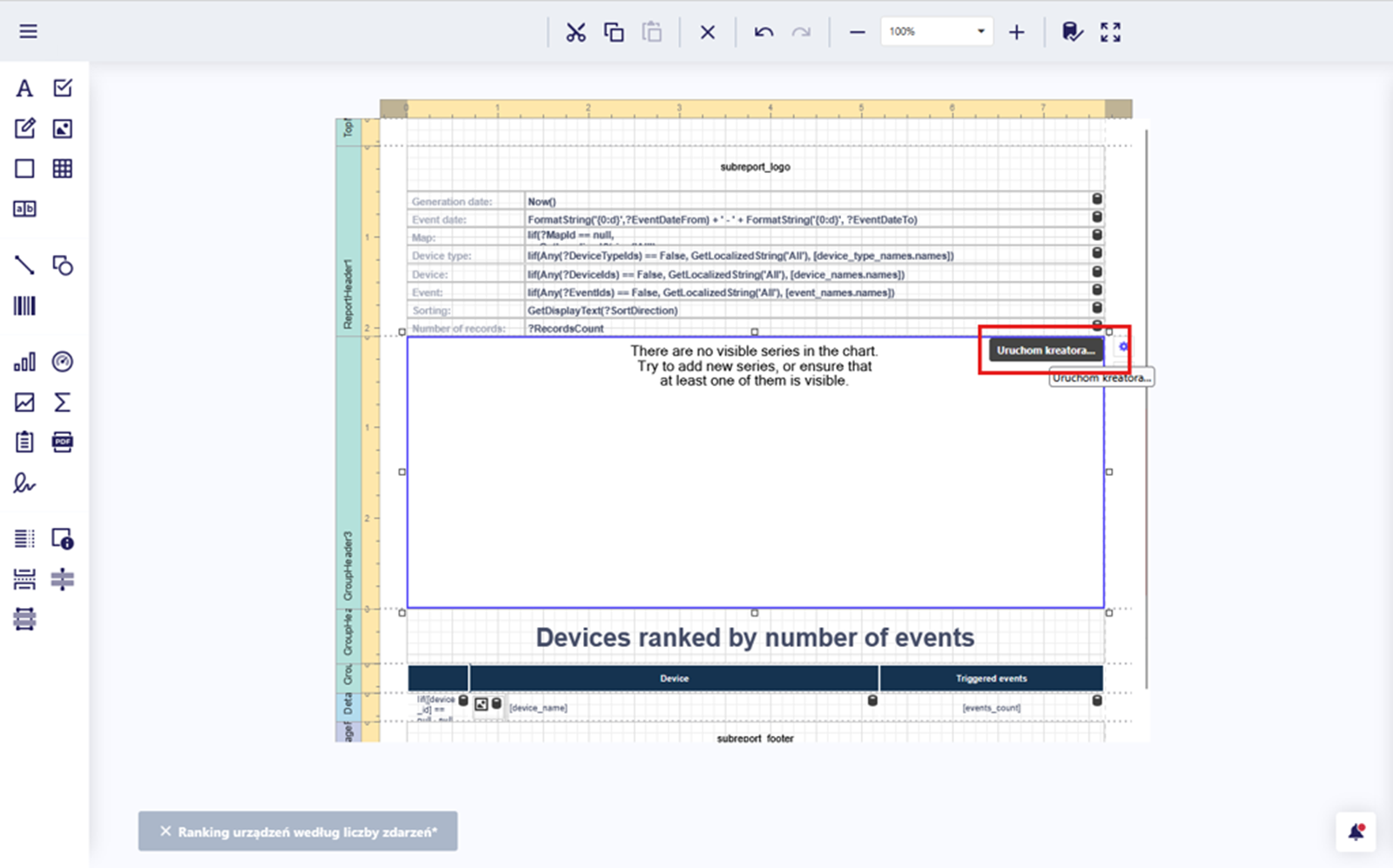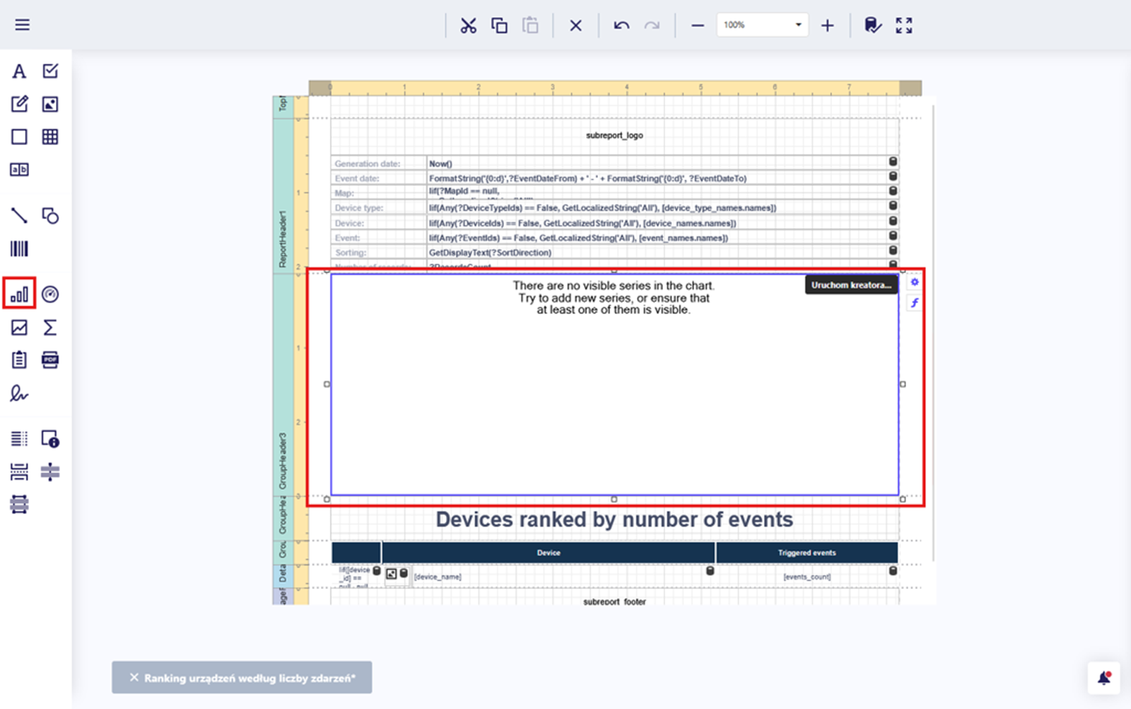 Cel: do raportu Ranking urządzeń według liczby zdarzeń dodać wykres słupkowy ilustrujący liczbę zdarzeń przypadającą na urządzenie.