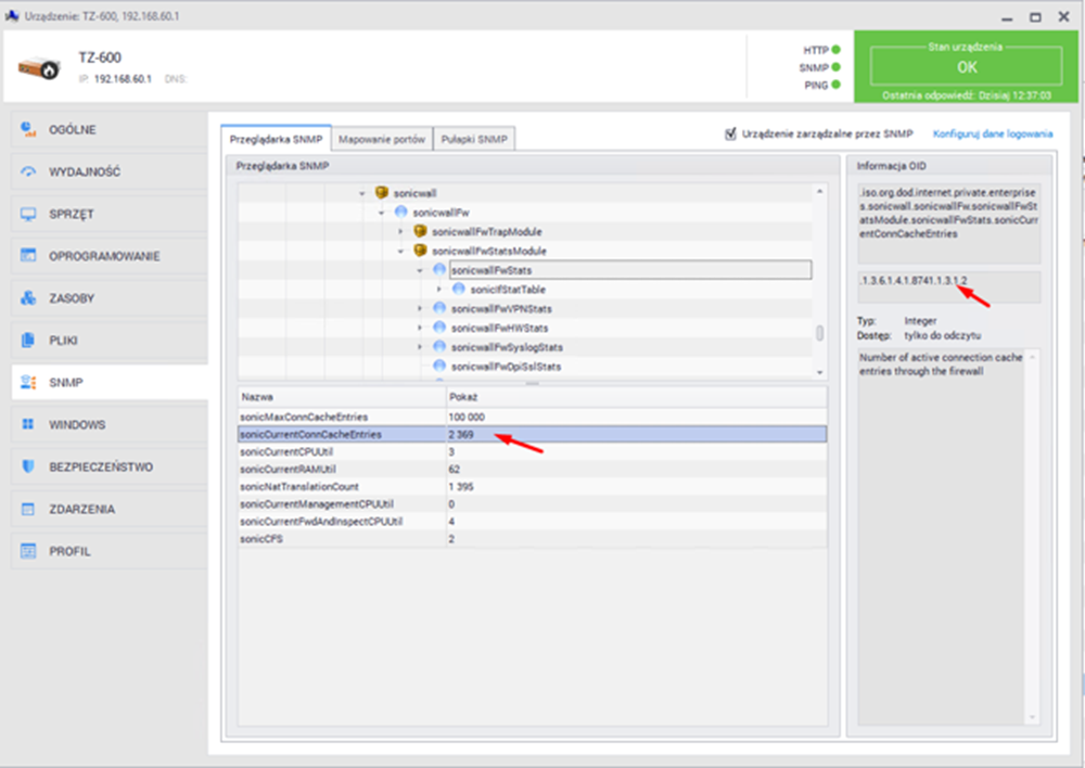 W nVision możesz monitorować wartości z drzewa SNMP dostępne w postaci liczb całkowitych (integer). W przeglądarce SNMP widoczne będą także inne dostępne wartości, np. ciągi znaków (string, octet string).