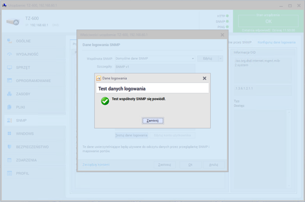 W oknie "Dane logowanie SNMP" podaj poświadczenia skonfigurowane w pkt.1. Jeśli poświadczenia będą prawidłowe, test danych logowania zakończy się komunikatem "Test wspólnoty SNMP się powiódł".