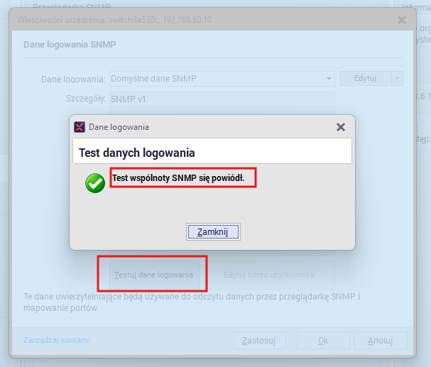 W oknie Dane logowanie SNMP podaj poświadczenia skonfigurowane w pierwszym kroku. Jeśli poświadczenia będą prawidłowe, test danych logowania zakończy się komunikatem "Test wspólnoty SNMP się powiódł".