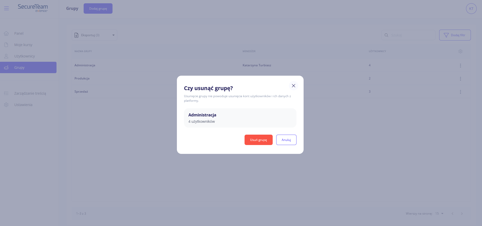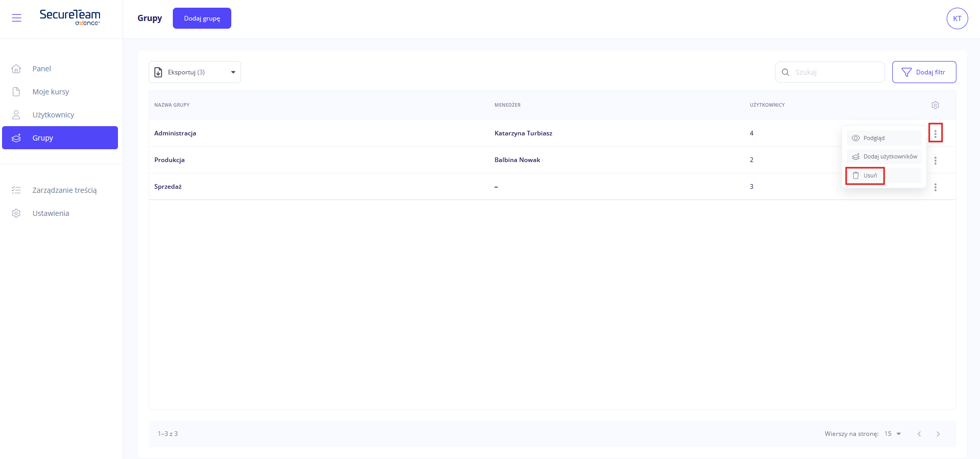 Usuwanie grupy Katarzyna Turbiasz 6/02/2026 15:59 Zaktualizowano Grupę usuniesz z poziomu listy grup.Operacja ta wymaga dodatkowego potwierdzenia.