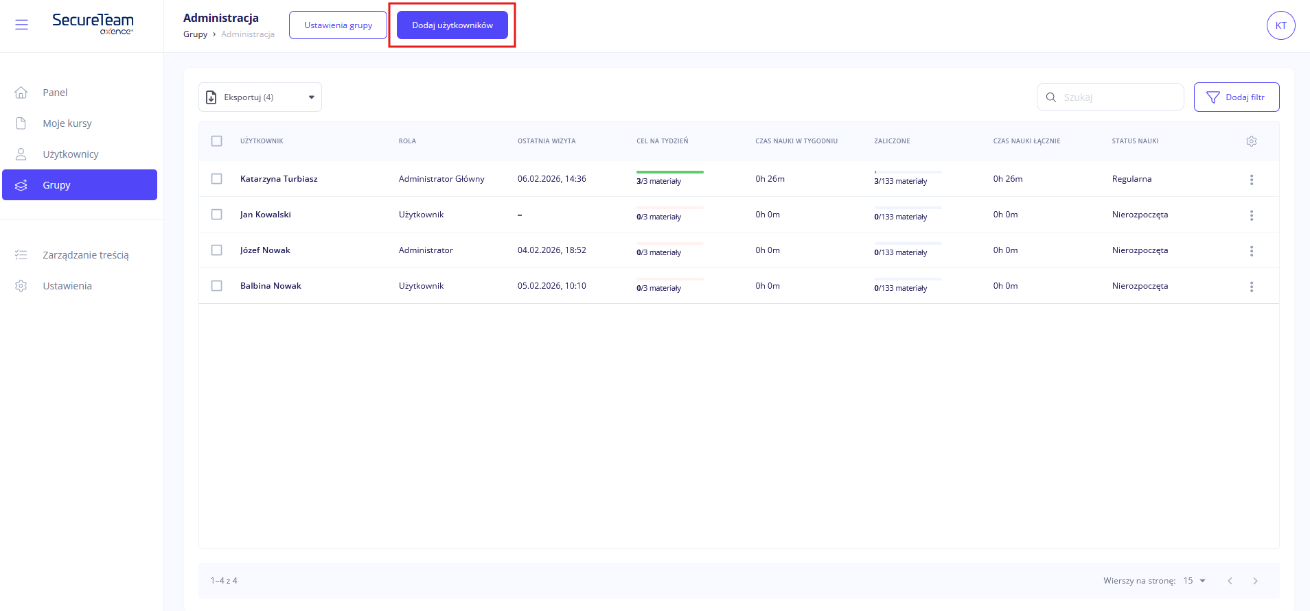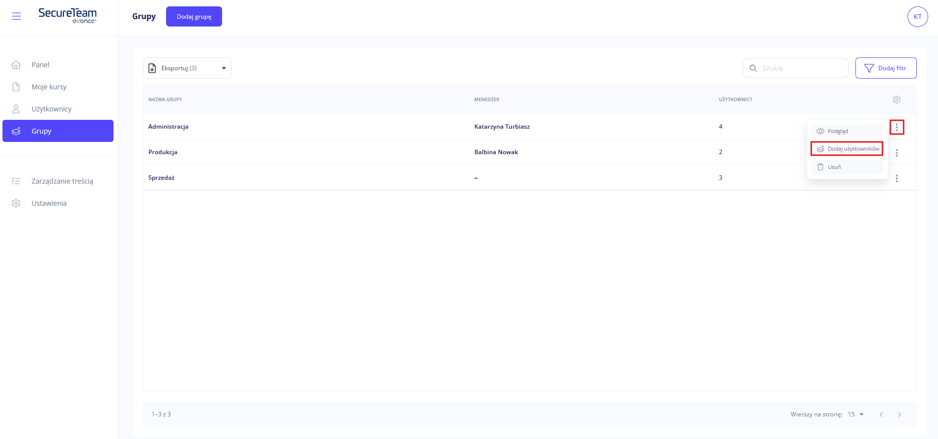 Użytkowników dodasz z poziomu listy grup lub w widoku podglądu grupy