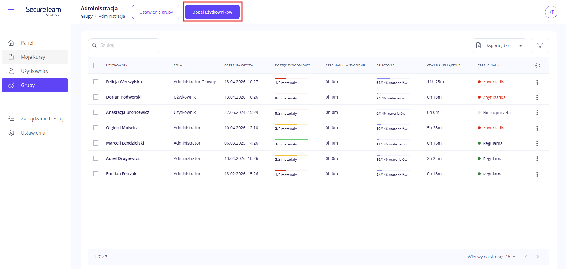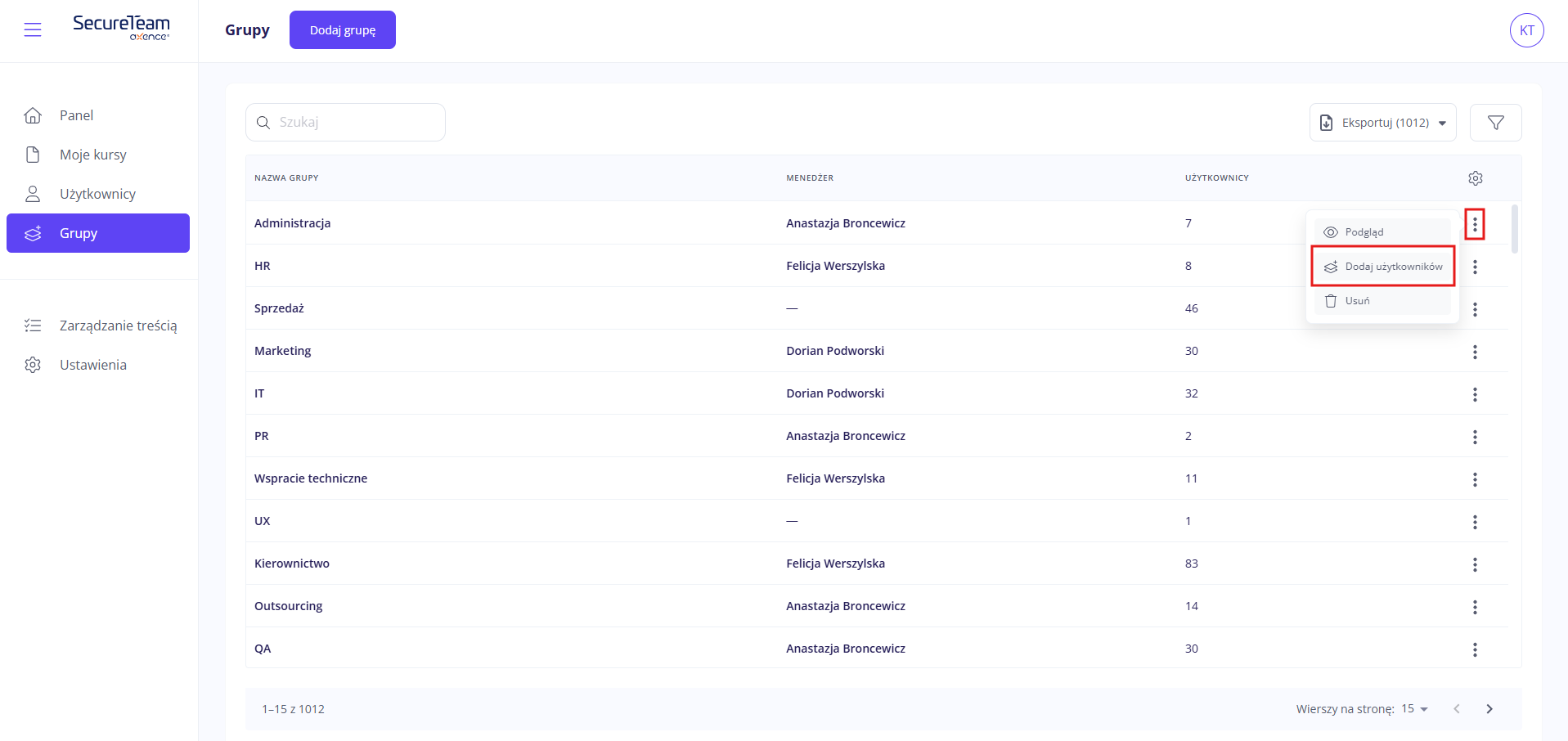 Jako Administrator możesz dodawać użytkowników do grupy. Zrobisz to z poziomu listy grup