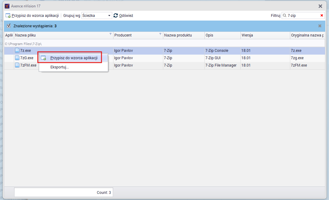 kliknij prawym przyciskiem myszy na znalezionym wpisie i wybierz opcję Przypisz do wzorca aplikacji: