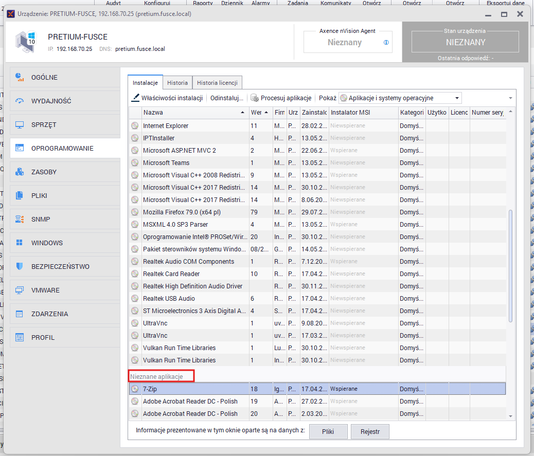 Uzyskane dane są dostępne w oknie informacji o urządzeniu, w zakładce Oprogramowanie: