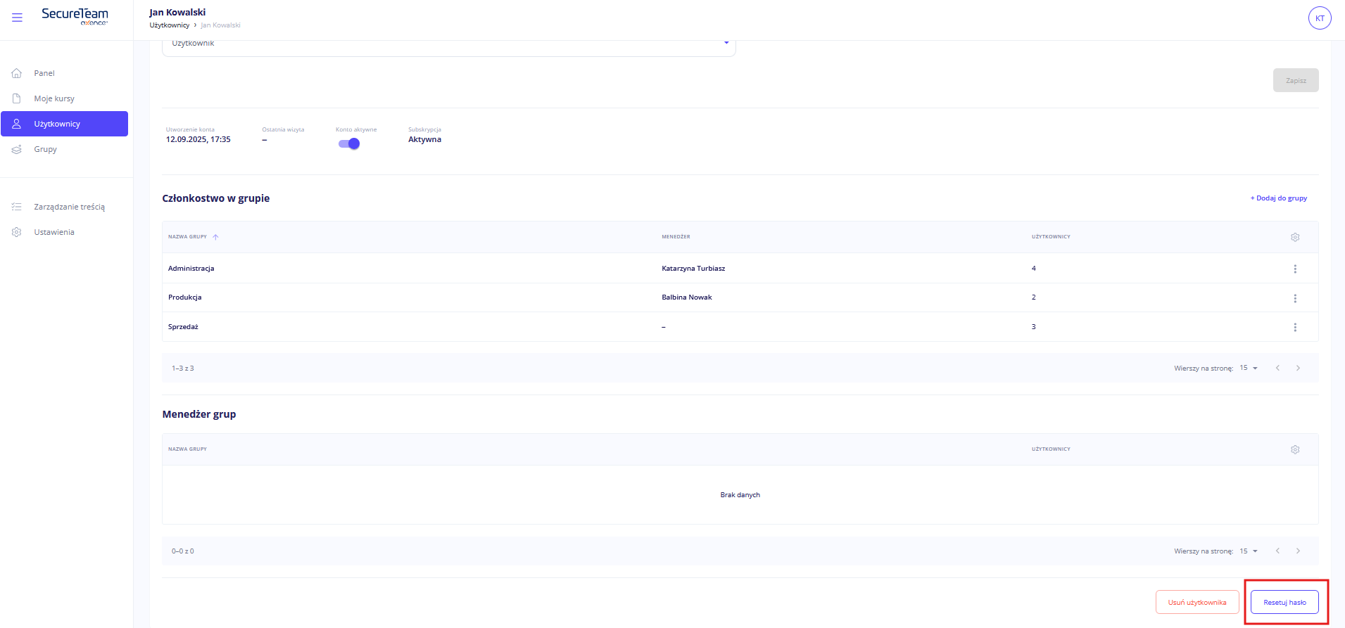 Innym sposobem odzyskanie hasła jest opcja Resetu hasła. Możesz ją wdrożyć, jeśli jesteś Administratorem w danej organizacji.