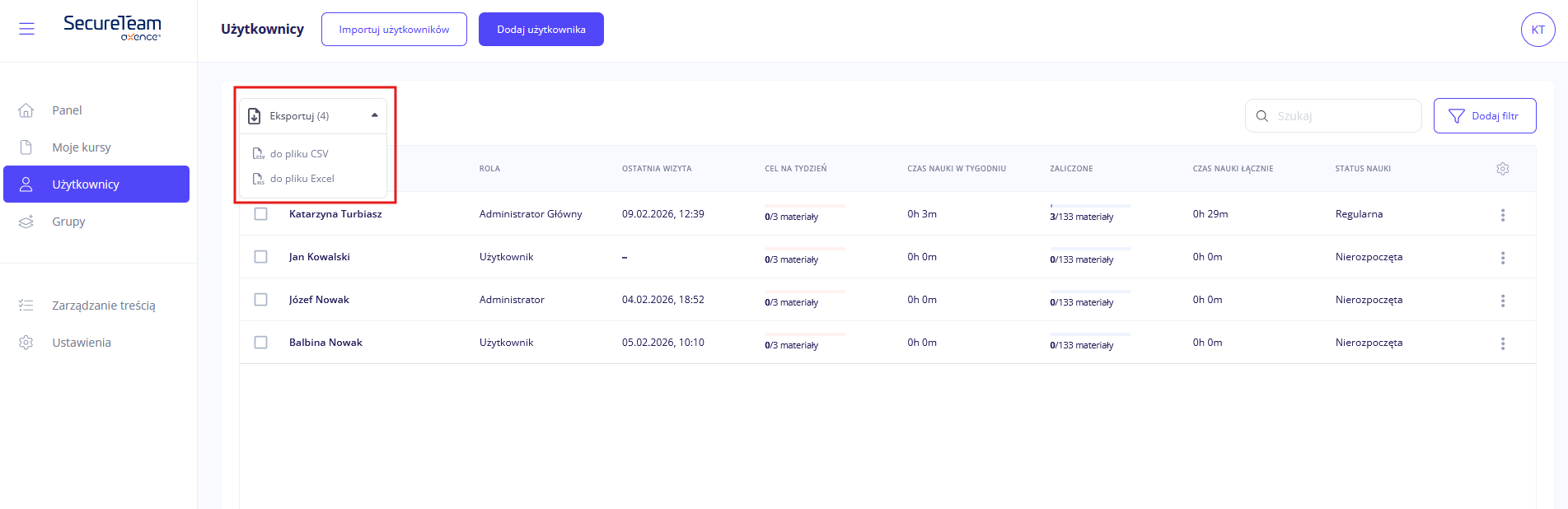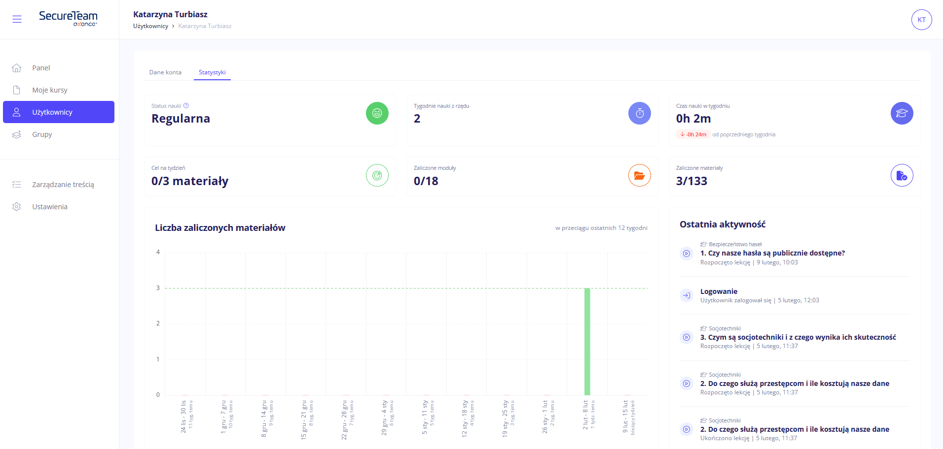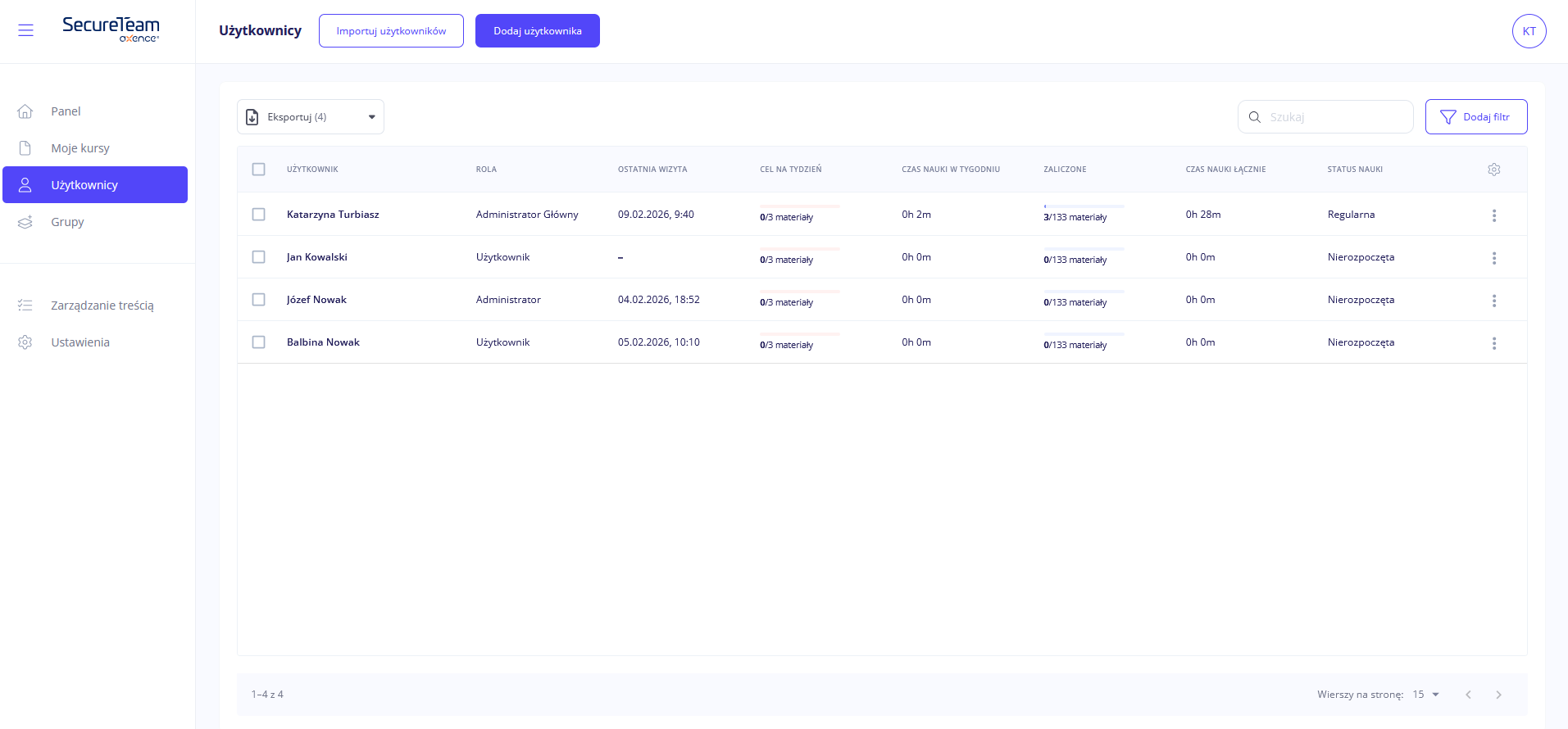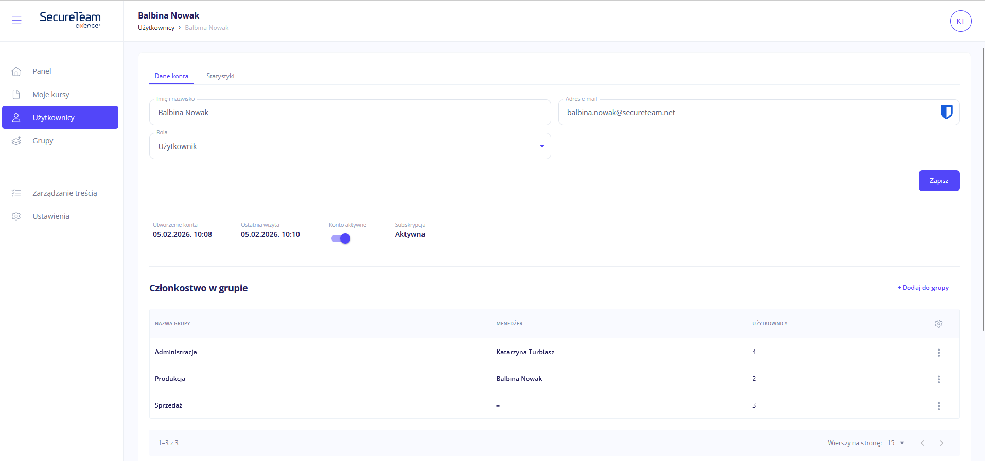Lista użytkowników i widok podglądu konkretnego użytkownika są dostępne tylko dla administratorów oraz menedżerów. Administratorzy mają dostęp do wszystkich użytkowników, podczas gdy menedżer może podejrzeć tylko tych, którzy należą do zarządzanych przez niego grup.