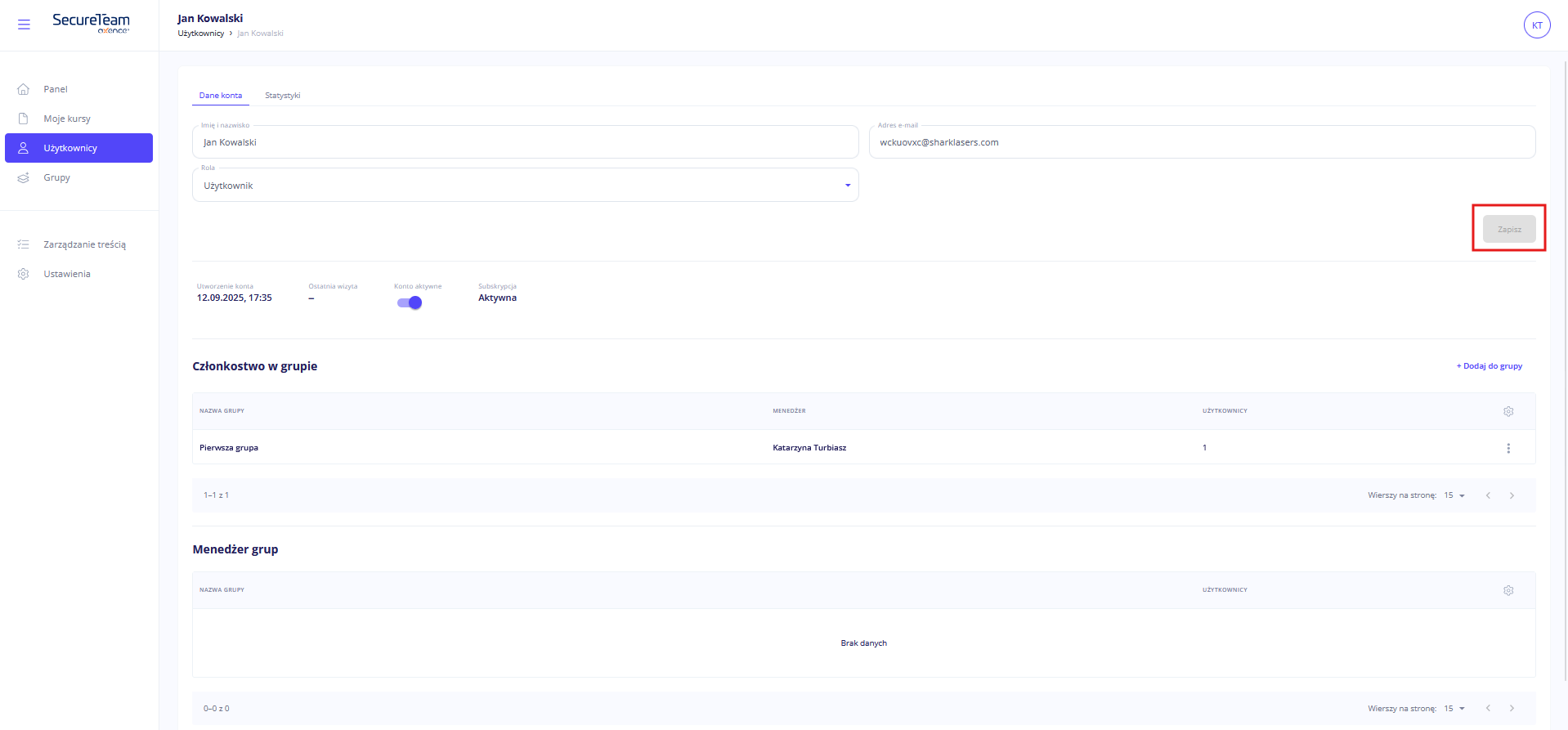 Jeśli dane użytkownika nie zmieniły się, przycisk Zapisz pozostaje nieaktywny.